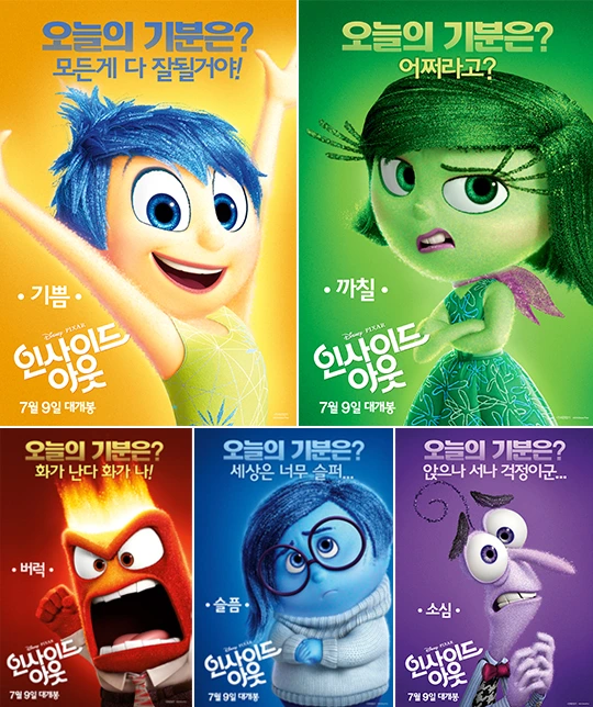이 영화의 가장 중요한 설정은 인간의 기억과 감정을 실체가 있는 물건이나 캐릭터로 표현했다는 점이다. 각 감정은 캐릭터가 되었고, 대표 색으로 구분된다. 황금색의 기쁨, 파란색의 슬픔, 보라색의 공포, 초록색의 역겨움(disgusted, 자막은 여러 가지 이유에 의해 까칠함으로 번역되었겠지만 역겨움이 더 적절하다고 생각한다), 빨간 색의 분노 등 다섯 감정이다.
