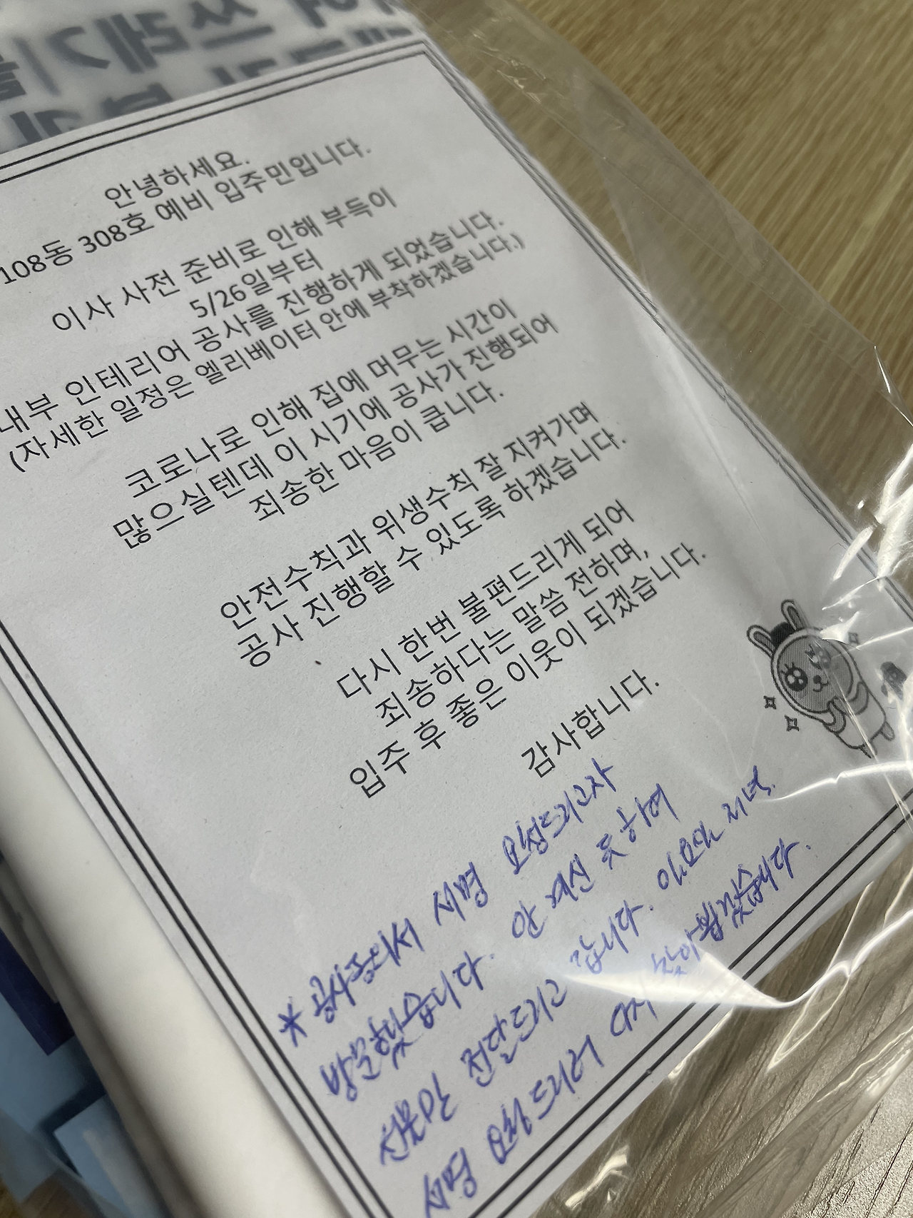 우리 집이 부재중이어서 내일 또 찾아뵙고 인사드리겠다고 따로 필기도 되어있는 쪽지를 보고는 얼굴도 안 본 3층의 이웃이 그렇게 예쁠 수가 없었습니다.