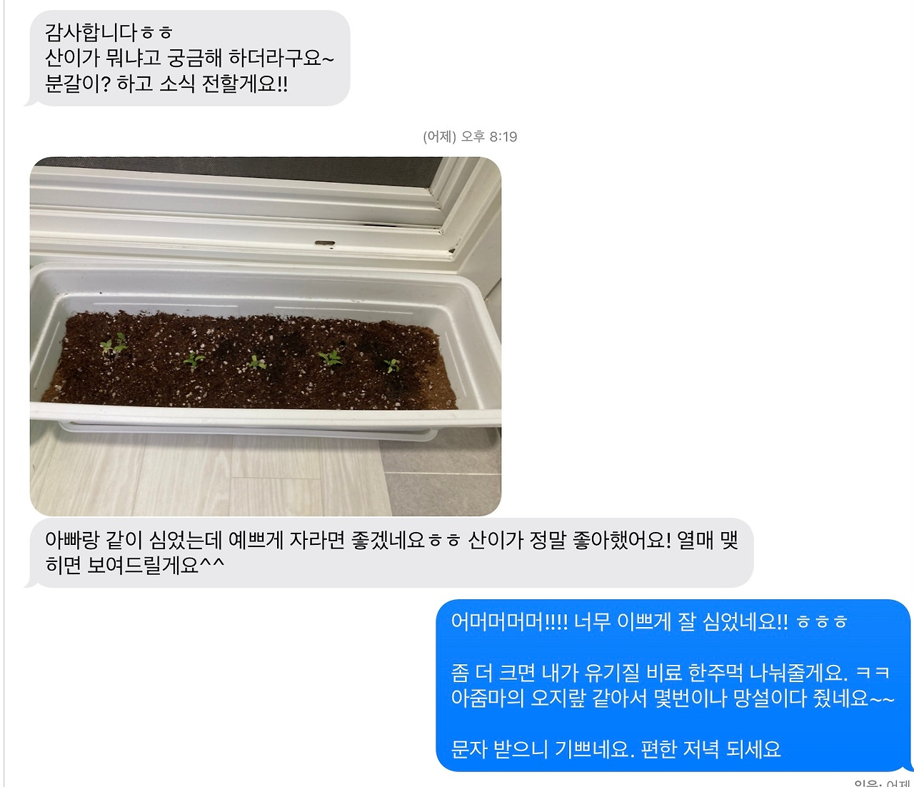 참다가 주말에 옆집 현관문이 빼꼼히 열려있길래 모종 세 개를 조심스레 갖다 주고는 귀찮으면 안 키우고 버려도 된다고 하고 돌아왔는데 그다음 날 문자가 왔습니다. 5살 아들이랑 재밌게 심었다면서 사진을 보내주는데 정말 기뻤어요.