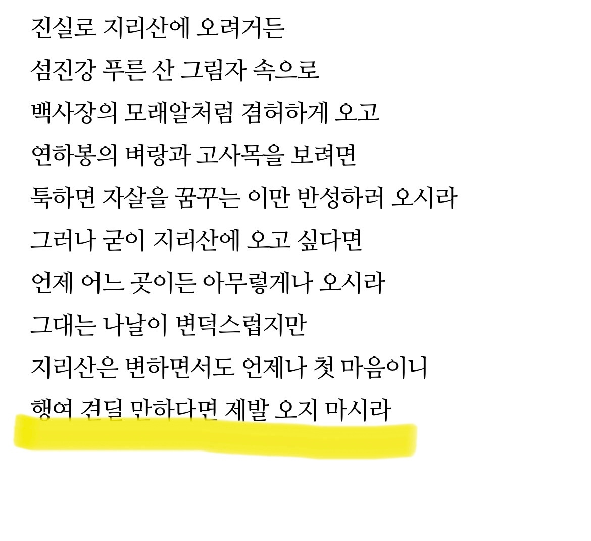 어느 시인이 쓴 지리산에 대한 시를 읽어보고 있었습니다. 맨 마지막 구절에 행여 견딜만하면 다시 오지 마시라… 하는 이 구절을 읽고 웃게 됩니다. 내가 지리산엘 올랐던 이유, 이 구절에 숨어 있어서이기도 합니다. 사정을 알 리 없는 세간 사람들에게 친정이 없어진 이유를 구구절절 알리는 것도 이젠 지겹고 괜찮다 하며 시간을 지나고는 있지만 명절이면 어쩔 수 없이 고향이 그리워지는 게 사람 마음이라 에라 모르겠다, 산이나 오르다 보면 온갖 시름 잊겠지 싶어 갔던 길이었으니까요.