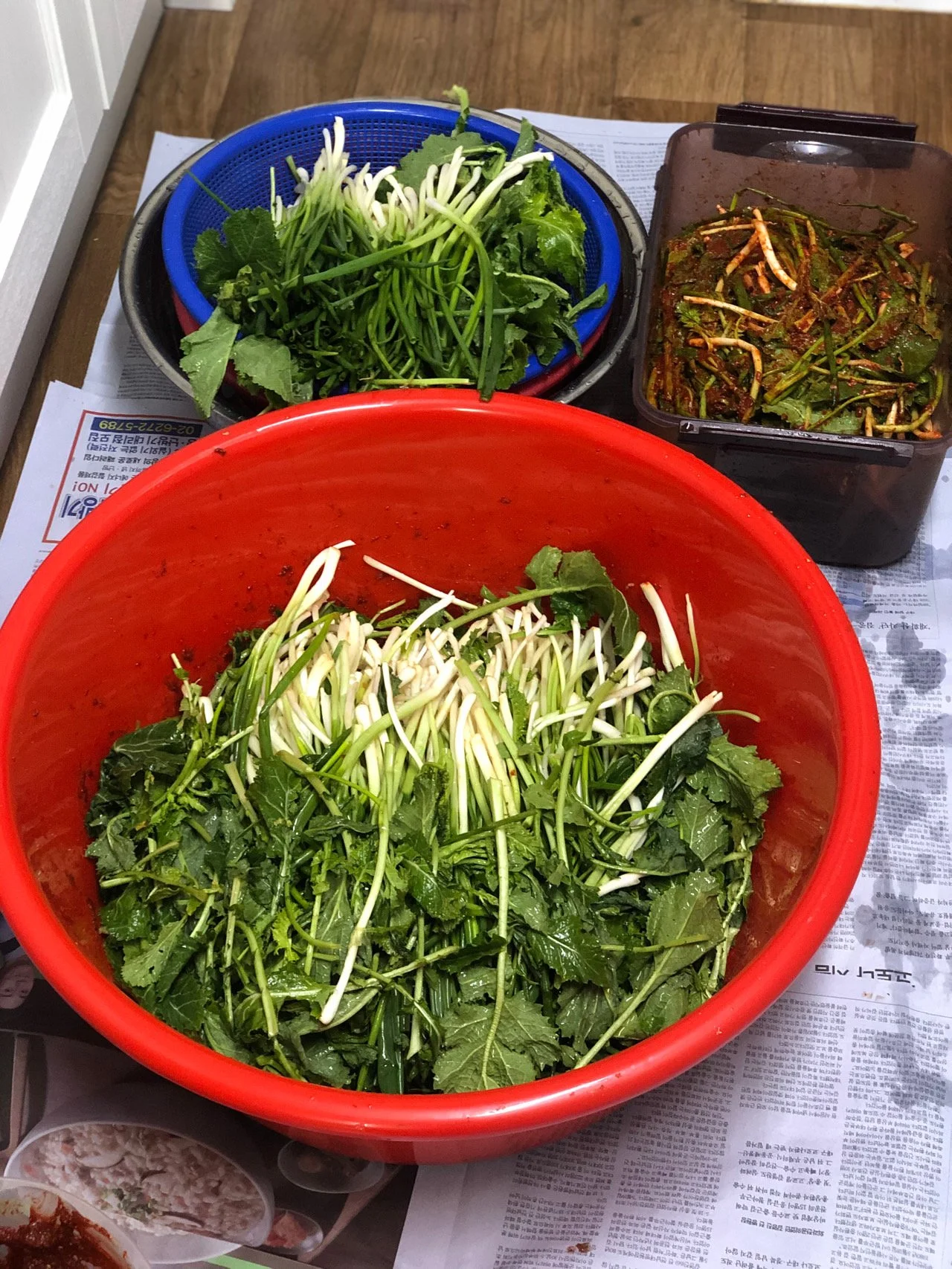 부엌 바닥에 신문지를 넉넉히 깔고 시작한 파김치 담그는 작업이 두 시간 만에 끝이 났다. 일을 다 끝내고 허리를 펴니 허리에서 우두둑 소리가 났다. 방문을 열고 딸아이가 나와 파김치 하나를 맨손으로 집어 먹었다.