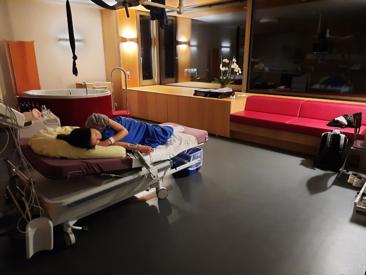 그새 시간이 흘러 5시가 되자, 오늘 출산을 도와주실 헤바메가 들어와 자기 소개를 했다. 스위스는 헤바메(Hebamme)라는 전문 조산사가 출산에서 의사 못지않게 중요한 역할을 담당한다. 출산의 전 과정이 헤바메의 지휘와 감독, 조력 아래 이루어지며, 결정적인 순간에 의사가 와서 출산을 마무리짓는 시스템이다. 마스크 너머로 보이는 헤바메의 따뜻한 갈색 눈동자에 조금 기운이 났다. 진통 간격이 짧아지면서 더욱 괴로워지자, 물속에 한 번 들어가 보기로 했다. 따뜻한 물속에서 근육이 이완되면 고통이 경감될거라 예상했지만... 아픈 건 그냥 아픈 거였다. 물속에 들어가자마자 힘을 주고 싶은 욕구가 오히려 더 강하게 찾아왔다. 30분 남짓 물속에 있다가 밖으로 나와 내진을 했는데, 헤바메가 "오, 그새 엄청 빠르게 진행됐다~아기 머리가 만져져! 이제 금방 나오겠는데?!"라며 희망적인 메시지를 전해주었다. 그래서 나는 진짜로 '금방' 아기가 나올 줄 알았으나 크나큰 착각이었다...