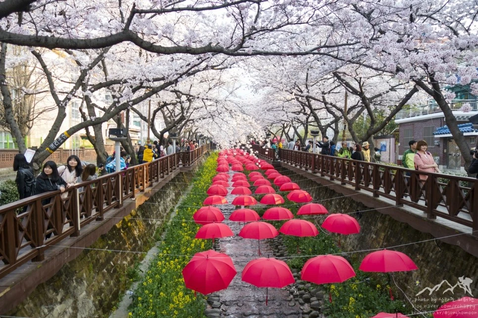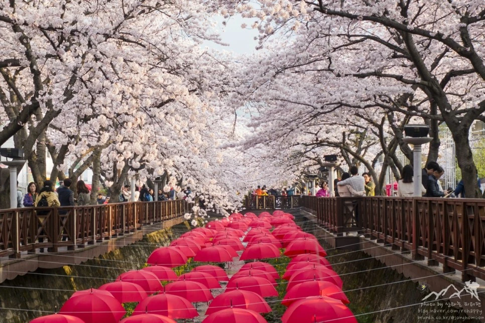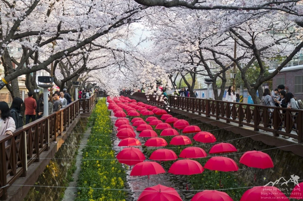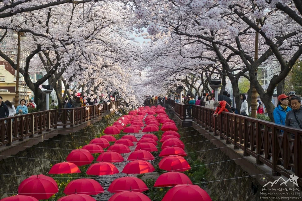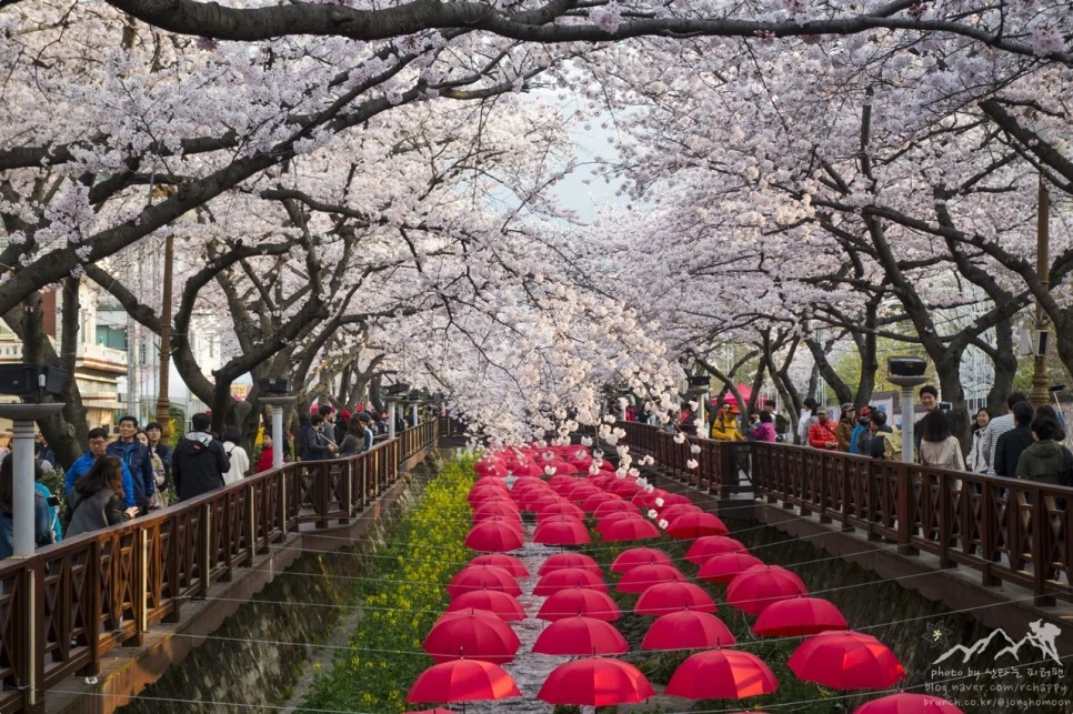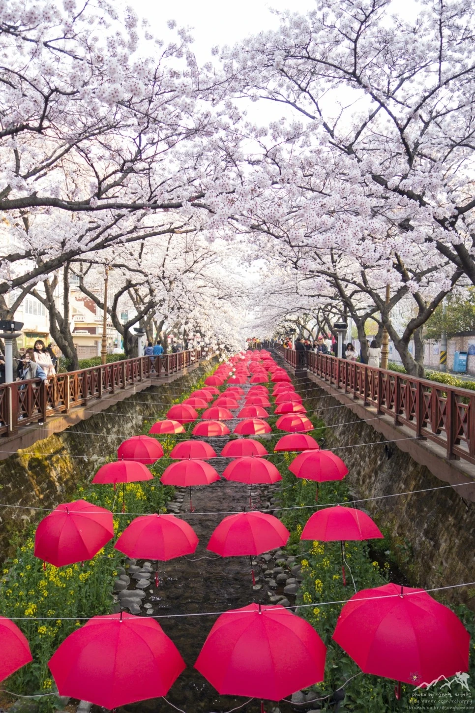여좌천 벚꽃길 길이는 약 1km 쯤 되는데 수많은 진사님들 사진에 올라오는 진해 벚꽃 하면 떠오르는 그곳! 우산 펴놓은 곳
