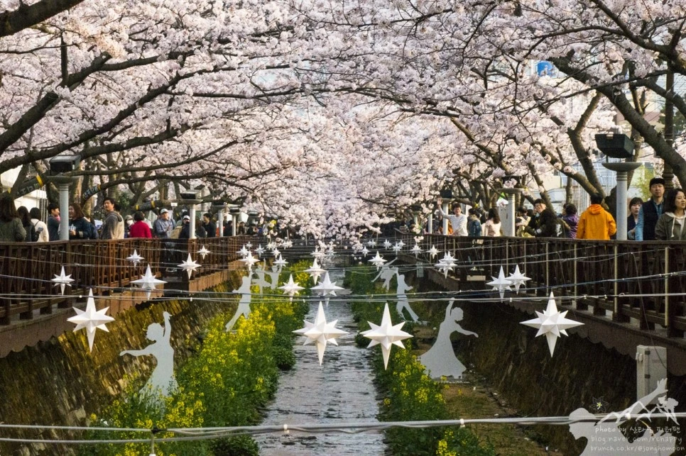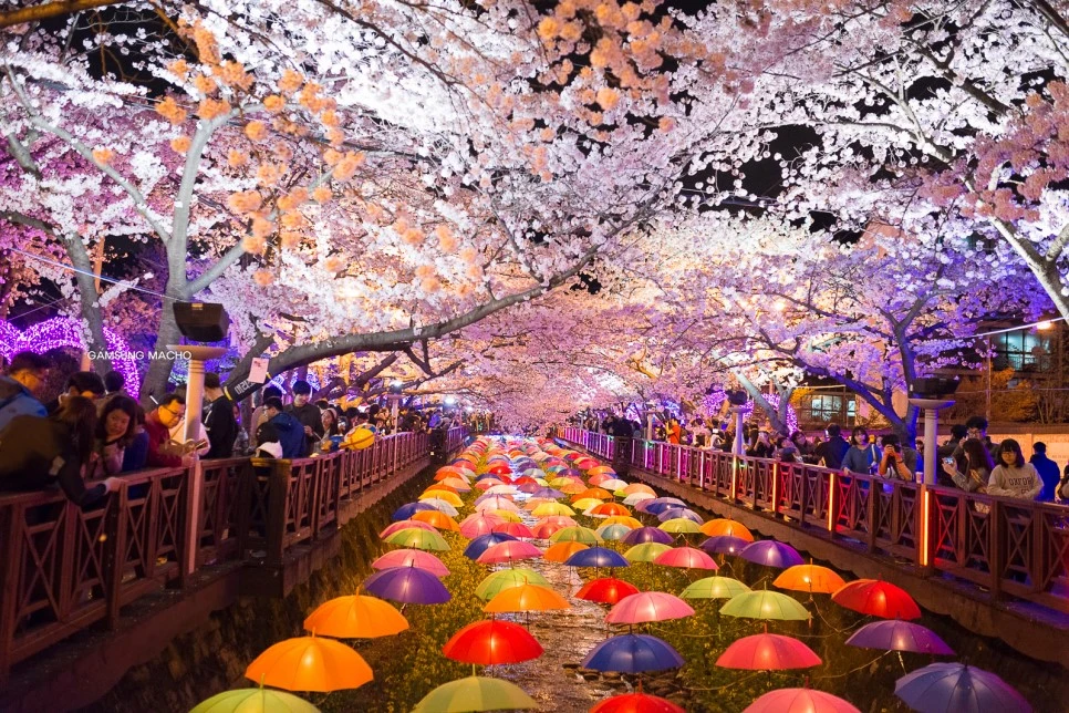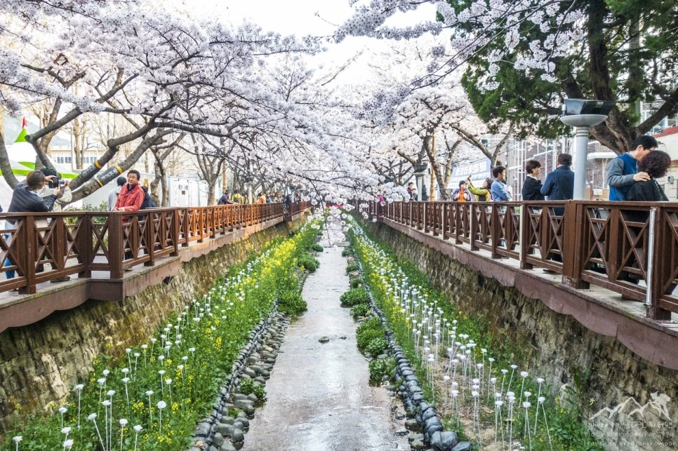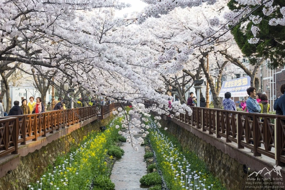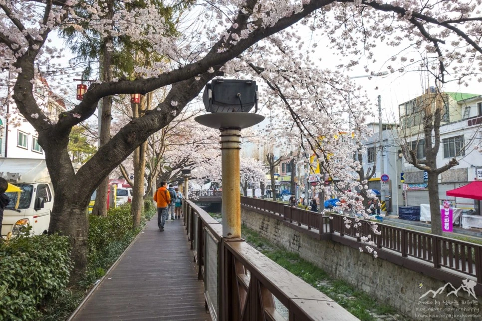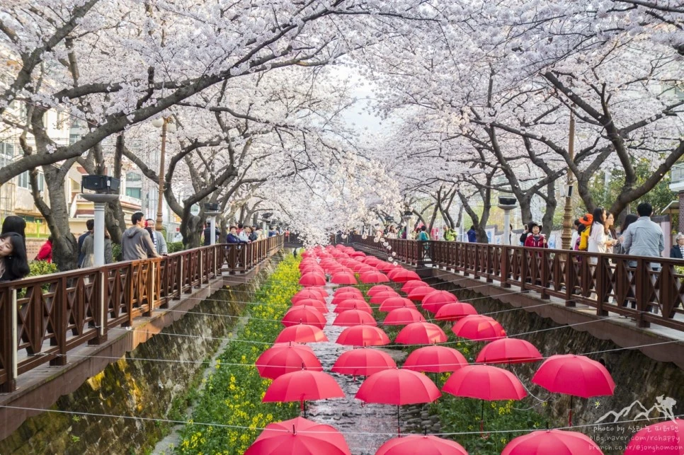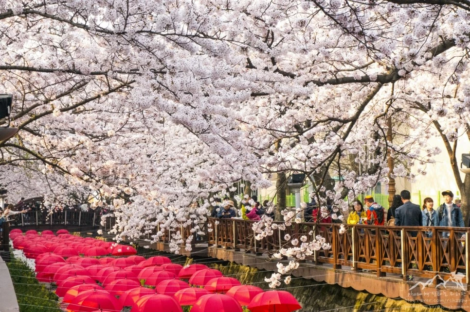 여좌천 벚꽃길 길이는 약 1km 쯤 되는데 수많은 진사님들 사진에 올라오는 진해 벚꽃 하면 떠오르는 그곳! 우산 펴놓은 곳