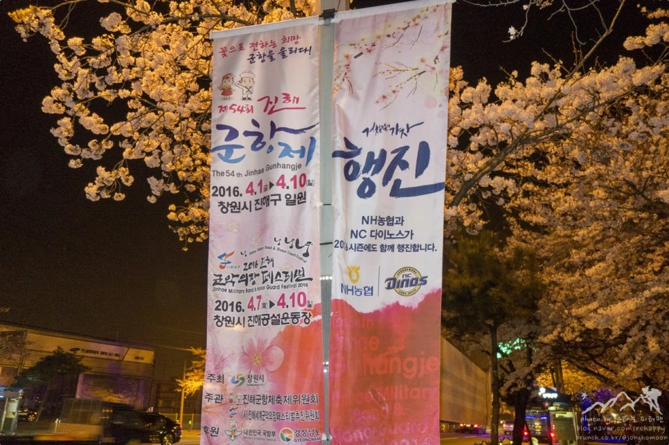 새벽에 진해를 도착해서 구경해야만 하는 이유는 오전 10시 부터~ 오후 7시까지 벚꽃 관련 행사장 및 관광지는 모두 차량진입을 통제하고 셔틀버스만 운행하고 인파로 인하여 밀려다닌다고 하기에 모든 사람들이 이른 새벽부터 움직이는것이 여유롭게 관광과 사진을 찍을수 있으니까 금요일 늦은 밤에 출발 하는것이 가장 좋은 방법! 단 여좌천은 주간,야간을 모두 봐야 하니 늦은 저녁까지 보고 오는것이 벚꽃의 모든것을 볼수가 있을것 같았다. 창원에서 있는 친구를 만났는데 야간의 조명시설이 낮보다 더 화려하고 멋지다고 하였다.