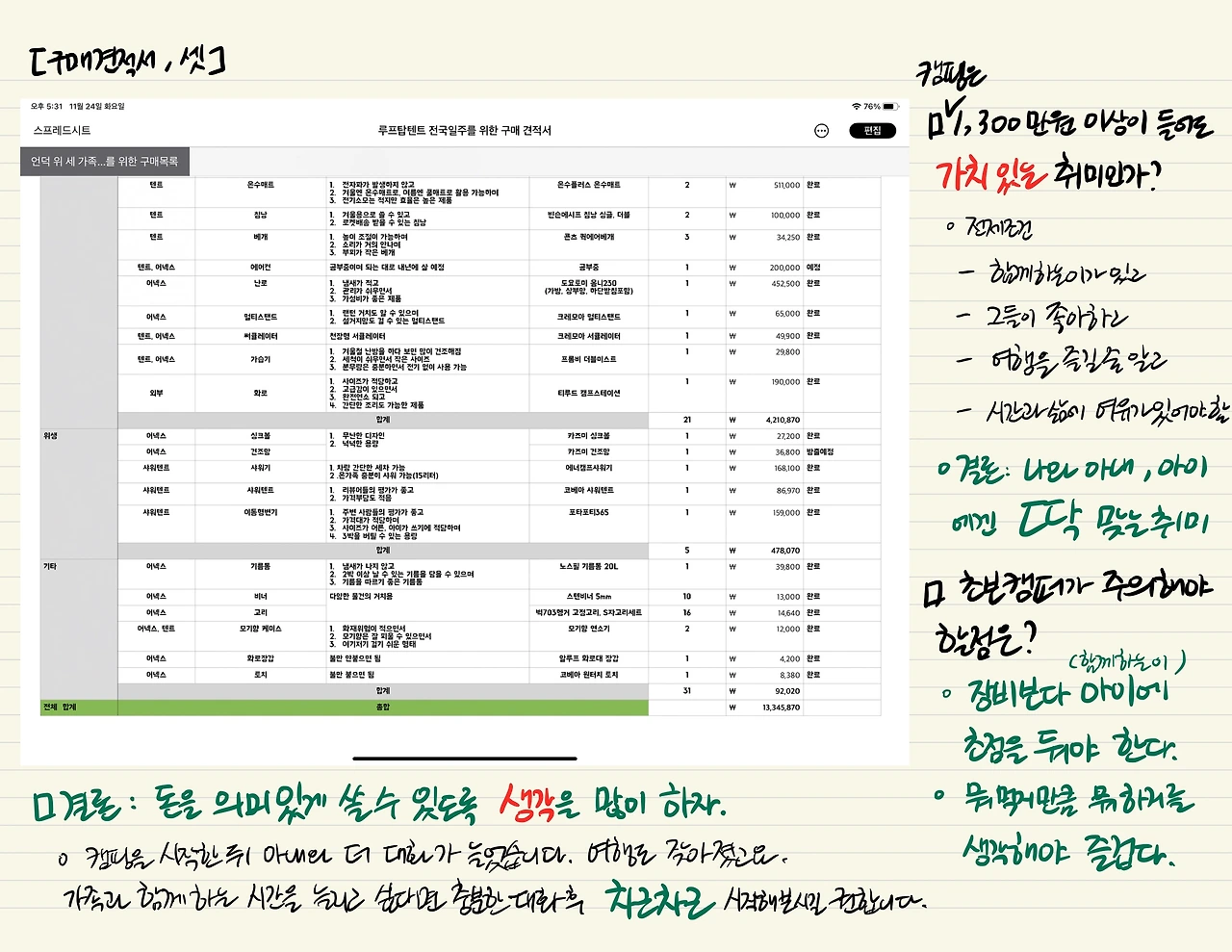 캠퍼의 길을 준비중이시라면장비를 사는 속도보다장비를 사는 방향을 먼저 정하세요.나중에 돌이키려면많은 돈을 잃을 수 있거든요.방향을 가족과 함께 잡으세요.그러면 멀리 오래 갈 수 있답니다 :)