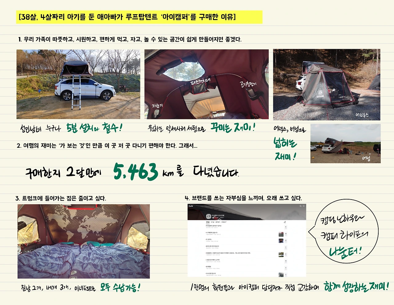 루프탑텐트 아이캠퍼를 3가지 이유 때문에 샀지만마지막 하나가 구매 후 더해졌습니다.네이버 공식카페가 매우 활성화 되어 있어캠핑장비 및 캠핑 노하우를 함께 공유하고,브랜드 담당자가 상주하며 브랜드를 관리하며,같이 성장하는 재미가 상당히 큽니다.루프탑텐트를 구매하시려고 한다면아이캠퍼를 추천합니다.