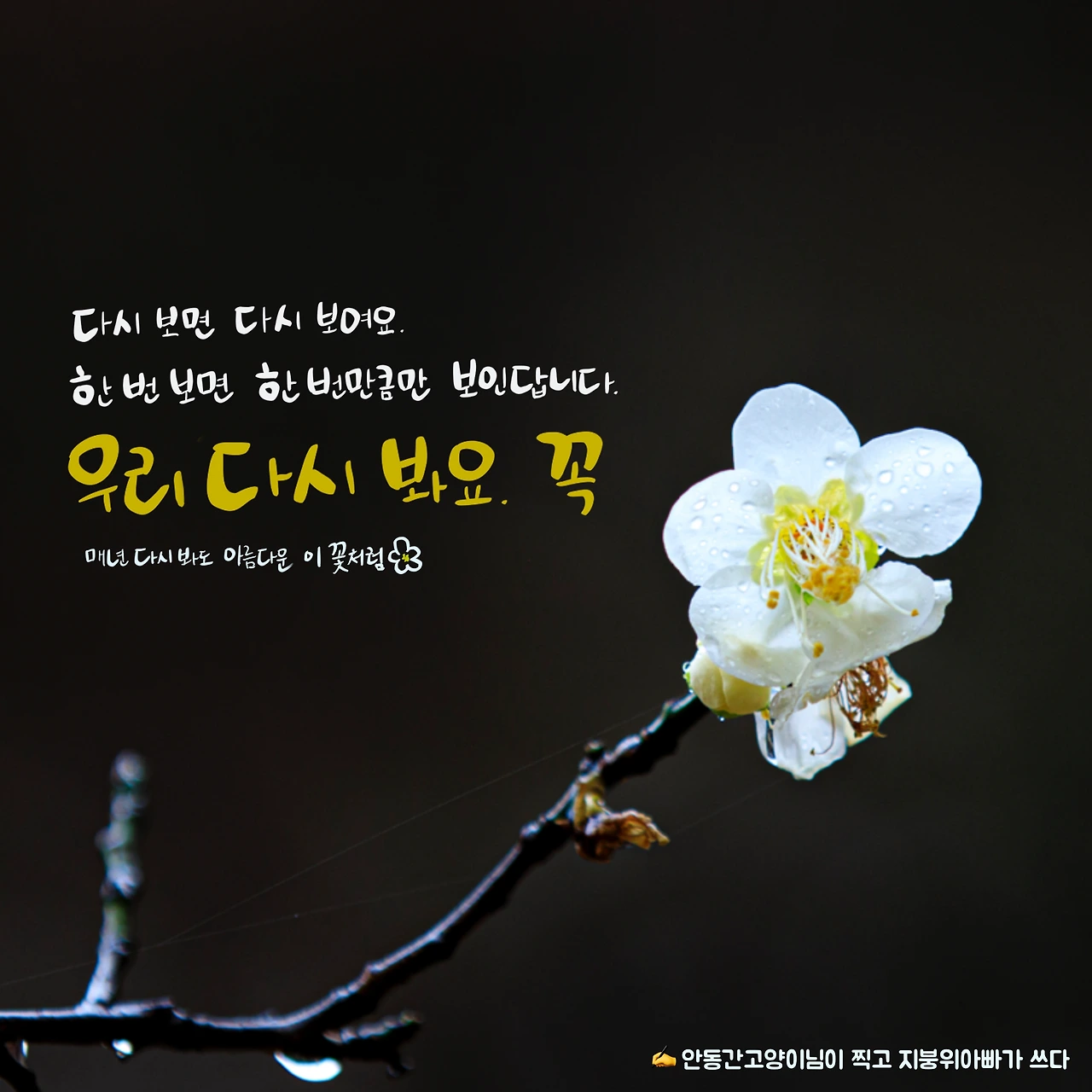 백문이 불여일견이라지만 본만큼 보이고, 본만큼 묻게 되는 것이 사는 이치인 듯 하다. 한 번만 보고 다 안다 판단할 때도 많지만 한 번 본만큼만 안다. 다시 봐야 한다. 다시 봐도 아름다운 봄꽃처럼 다시 보면 다시 보인다. 다시 보자. 나도, 그대도, 이 삶도.
