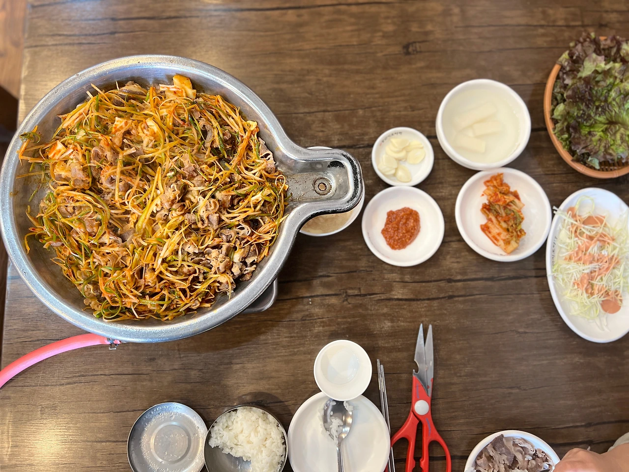 장군시오야끼는 내 본가가 최애하는 음식이다. 해군 제1함대 장병들이 외박 나오면 가장 먼저 찾는 맛집이라 한다. 음식이 맛은 예상 가능하다. 잘 버무린 채소와 고기기름이 많은 대패삼겹 혹은 우삼겹을 함께 굽고 익히는 음식이다. 쌉싸름한 상추쌈과 궁합이 좋다. 맛은 기본맛부터 매운맛까지 3단계가 있는데 기본이 무난하다. 6살 맵린이 아들도 잘 먹는다. 아들은 오늘 동굴이 제일 중요했기에 삼겹살을 동굴 같은 목구멍에 넣으면서도 온통 동굴 타령이다.