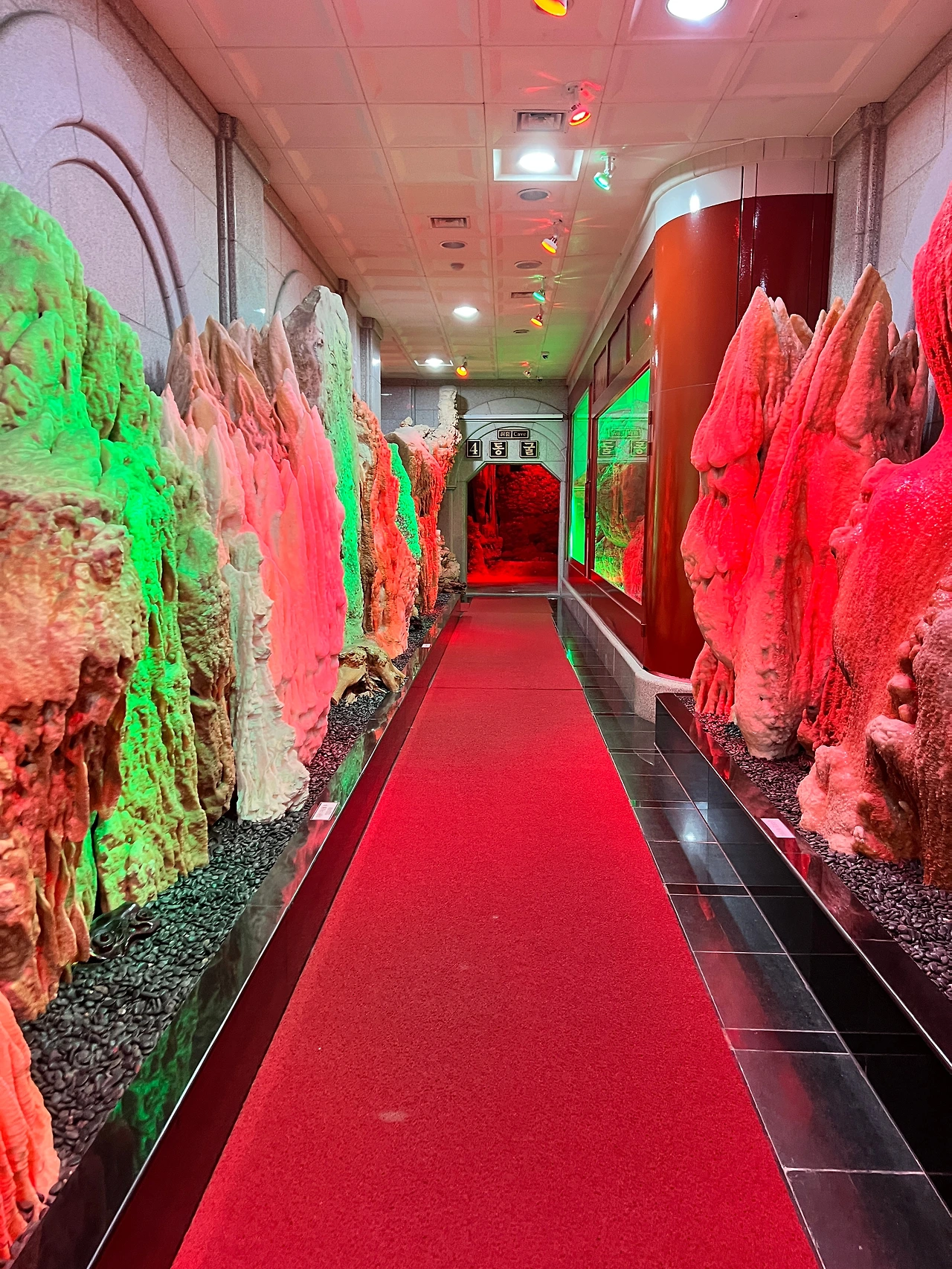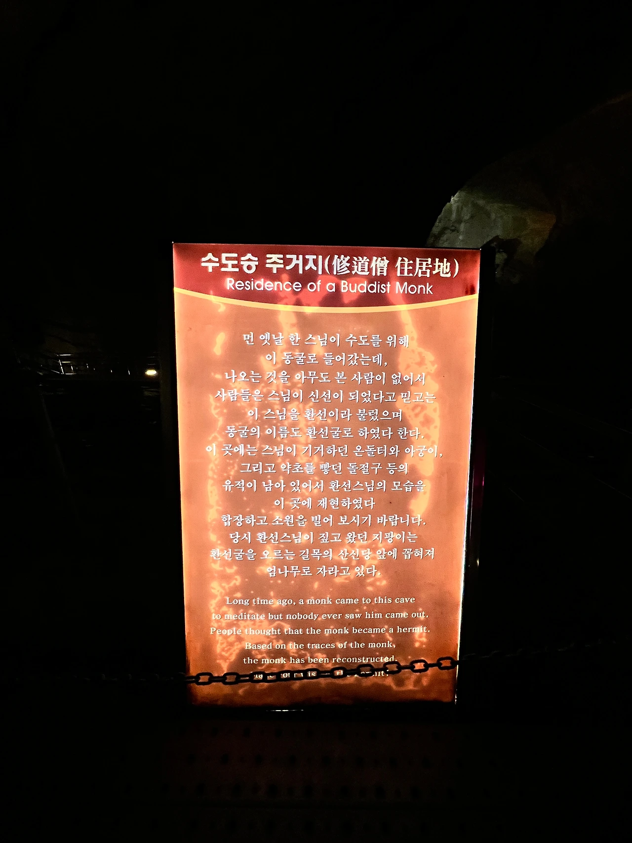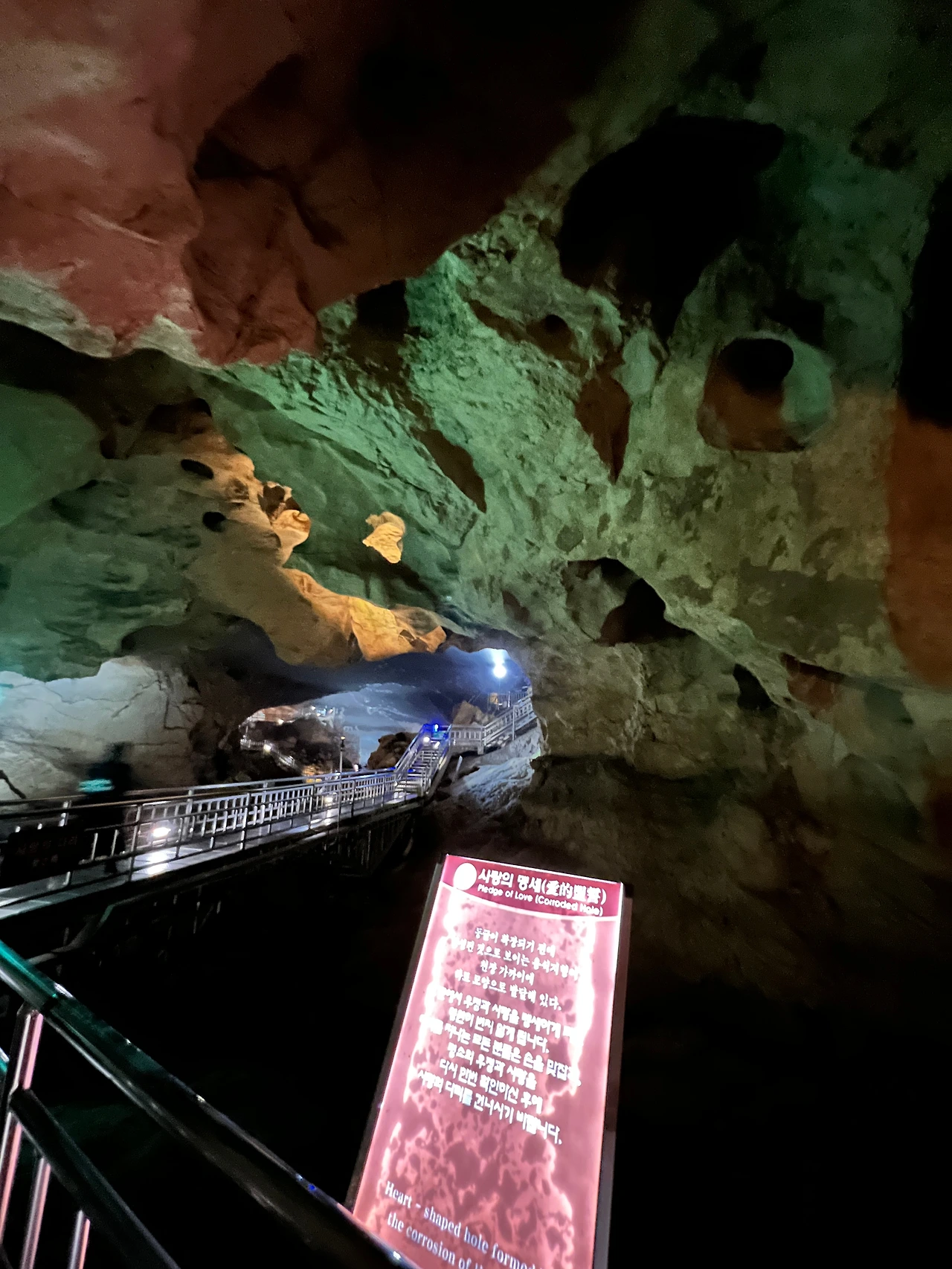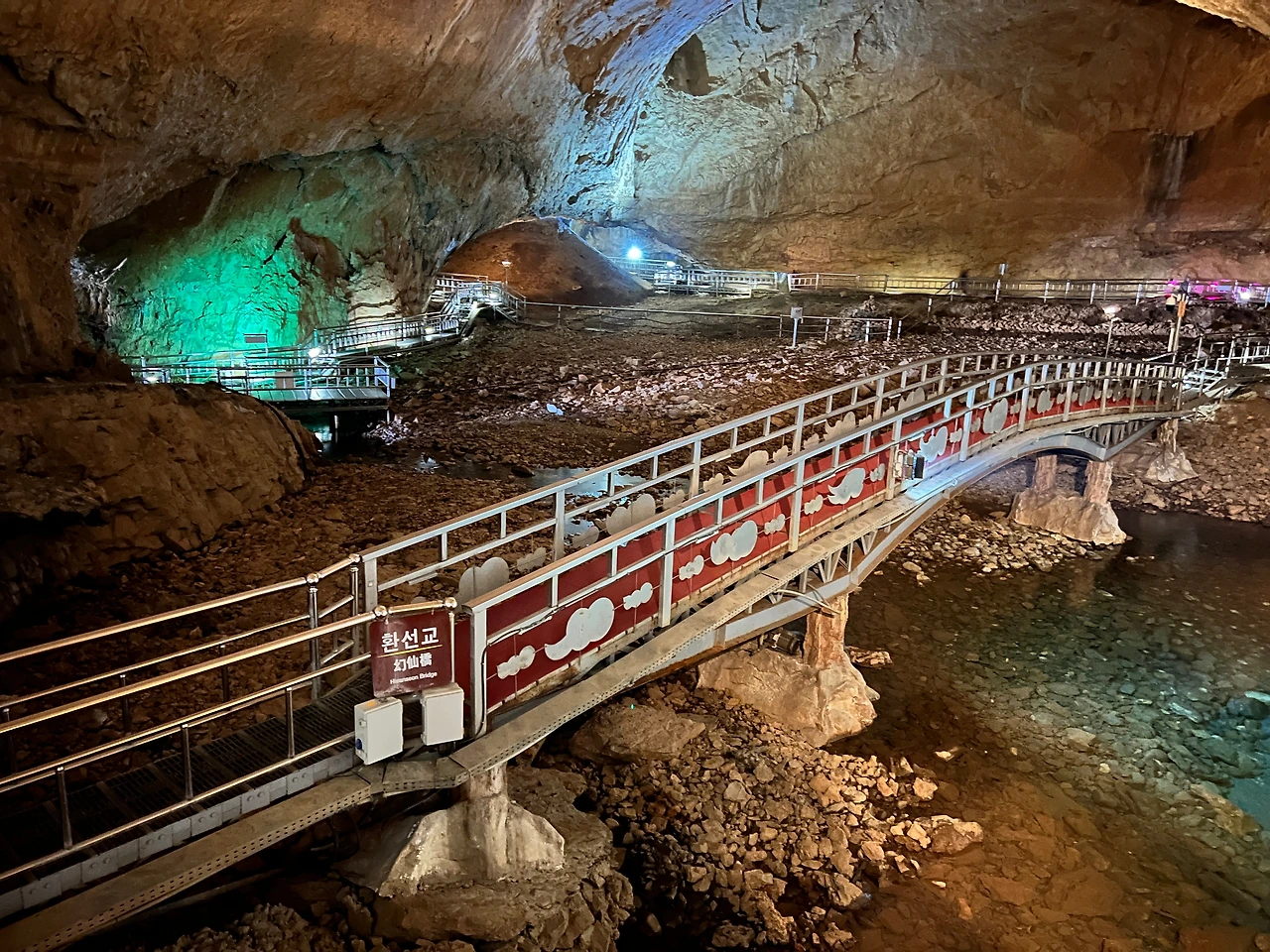 환선굴이라는 이름은 어떤 스님이 도를 닦기 위해 이 동굴에 들어왔는데 오랫동안 돌아오지 않아 신선이 되었다는 이야기가 있어 환선이라는 이름을 붙였다고 한다. 그런 이야기를 담은 동상도 있고, 종유석에 대한 소개는 물론 다양한 이벤트 존(국토 모양의 공간, 사랑의 맹세 존, 무지개 전등 다리)을 만들어놓아 즐기는 재미가 크기만큼 컸다.