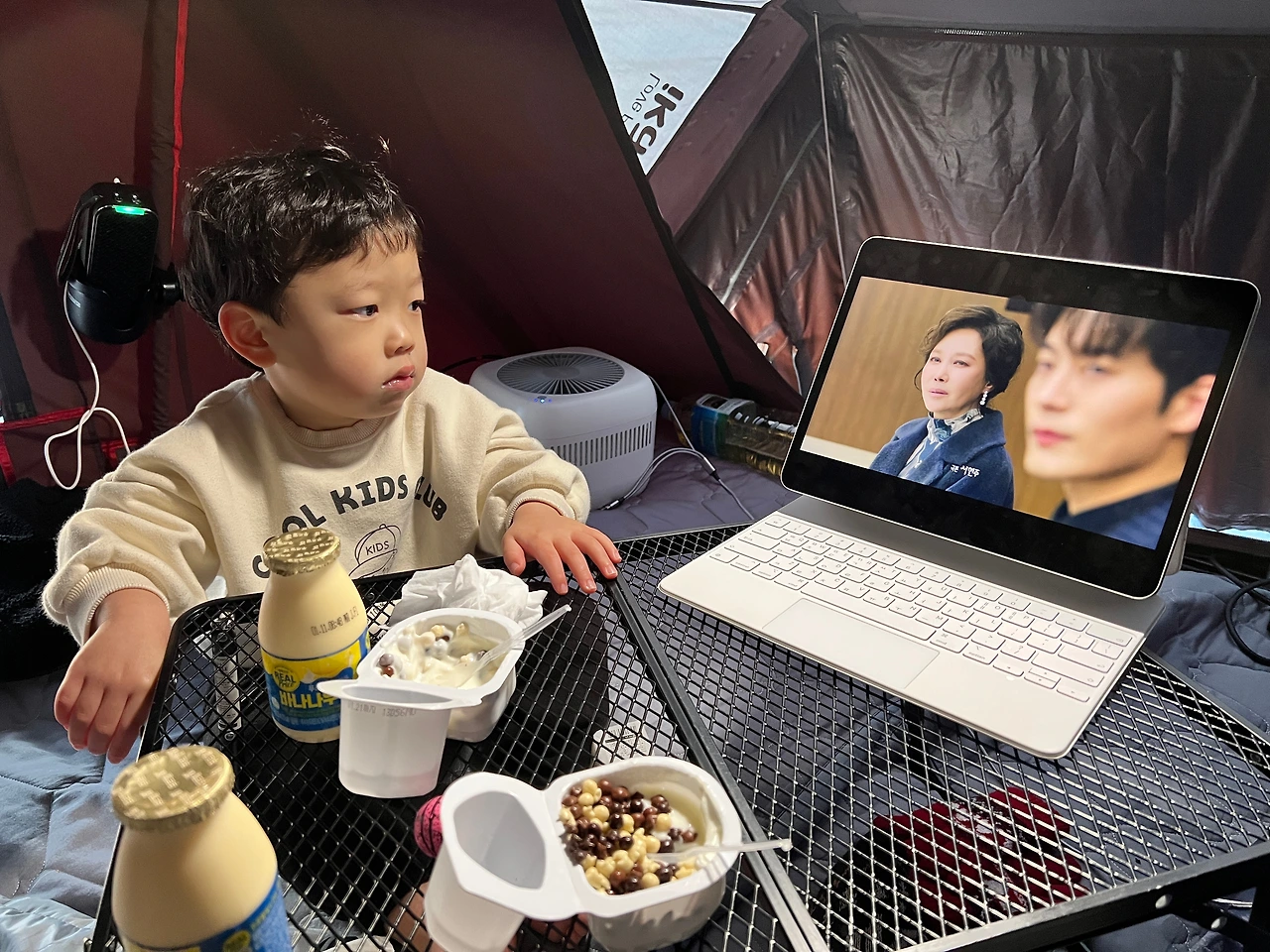 캠핑 출발 전부터 아침식사는 비조리식으로 간편하게 한다는 계획을 잡았다. 다행히 아들도 좋아한다. 비요뜨, 샌드위치, 우유의 조합은 필승조합이다. 냉장고가 살렸다. 부자캠핑의 필승조합인 아이캠퍼와 어넥스S의 콜라보도 훌륭하다. 간편하게 접고 떠난다.