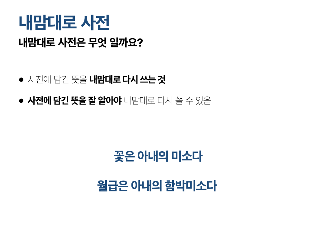 글쓰기 코칭 중 고객 분들과 가장 많은 시간을 쓰는 게 '내 맘대로 사전'입니다. 뜻을 내 맘대로 다시 쓰는 거죠. 기획 훈련도 되고, 글쓰기 스킬도 늘리는 글쓰기 연습법 끝판왕입니다. 사전에 담긴 뜻을 잘 알아야 내 맘대로 다시 쓸 수 있기에 의미 파악은 필수예요.