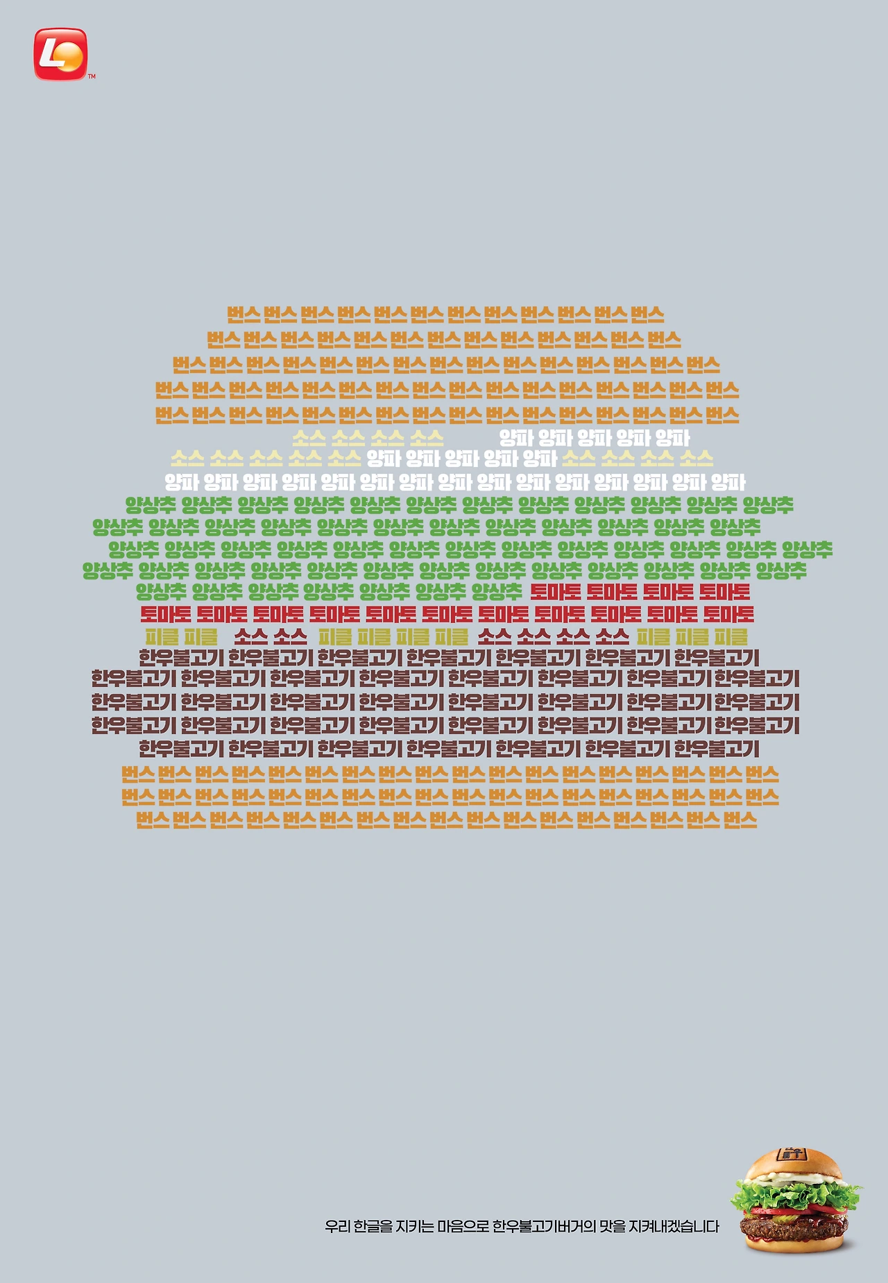 글로 햄버거를 그리면 이런 모양입니다. 한글날에 어울리는 한우불고기버거 광고입니다. 롯데리아가 가진 한글, 한국에 대한 존중, 그리고 위트가 드러납니다. 글로 그림을 그리면 이런 매력이 있습니다.