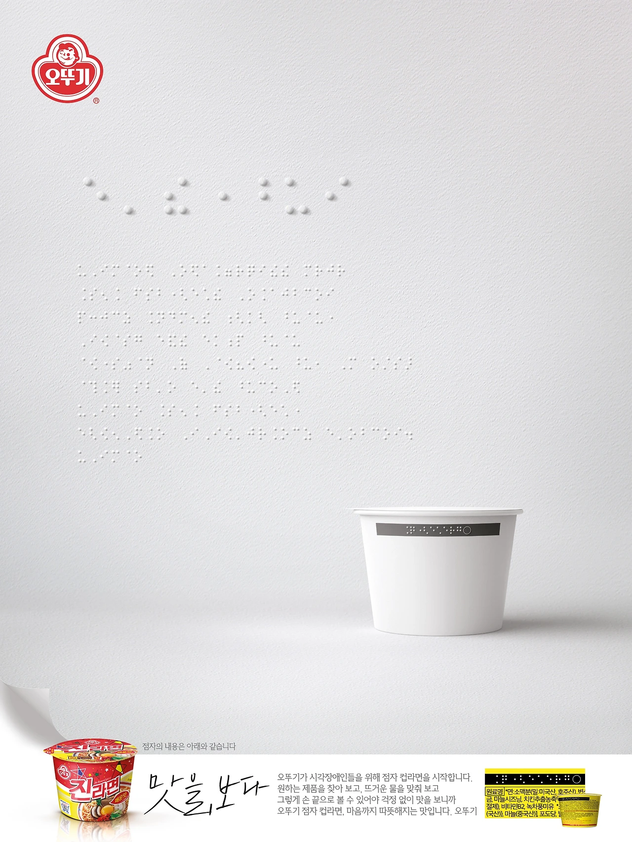 점자 컵라면은 시각장애인에게 라면을 글로 그려 줍니다. 우리에겐 오뚜기가 얼마나 따뜻한 기업인지 떠올리게 하죠. 많은 말, 글이 없어도 충분히 전해지는 좋은 글그림입니다.