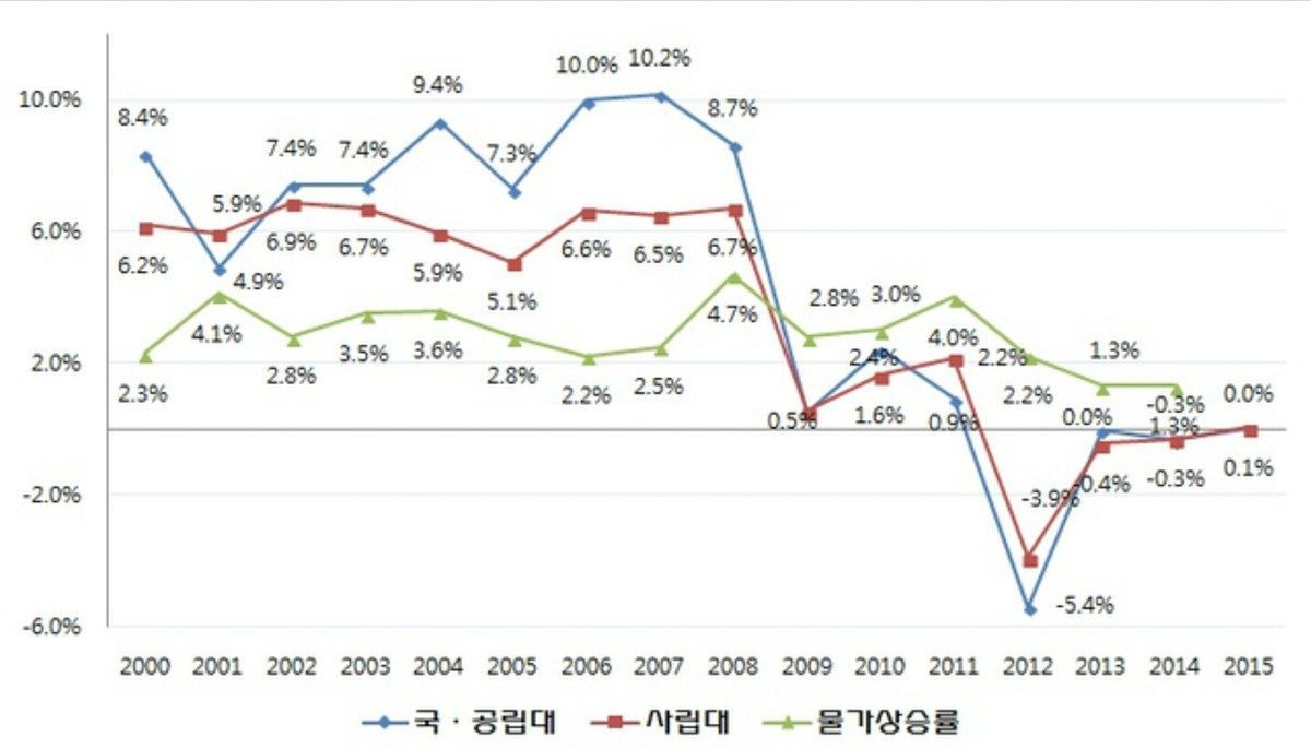 하늘높은줄 모르고 10여년간 치솟아버렸고, 그 부담은 고스란히 현재의 20대들이 지게 되었다.