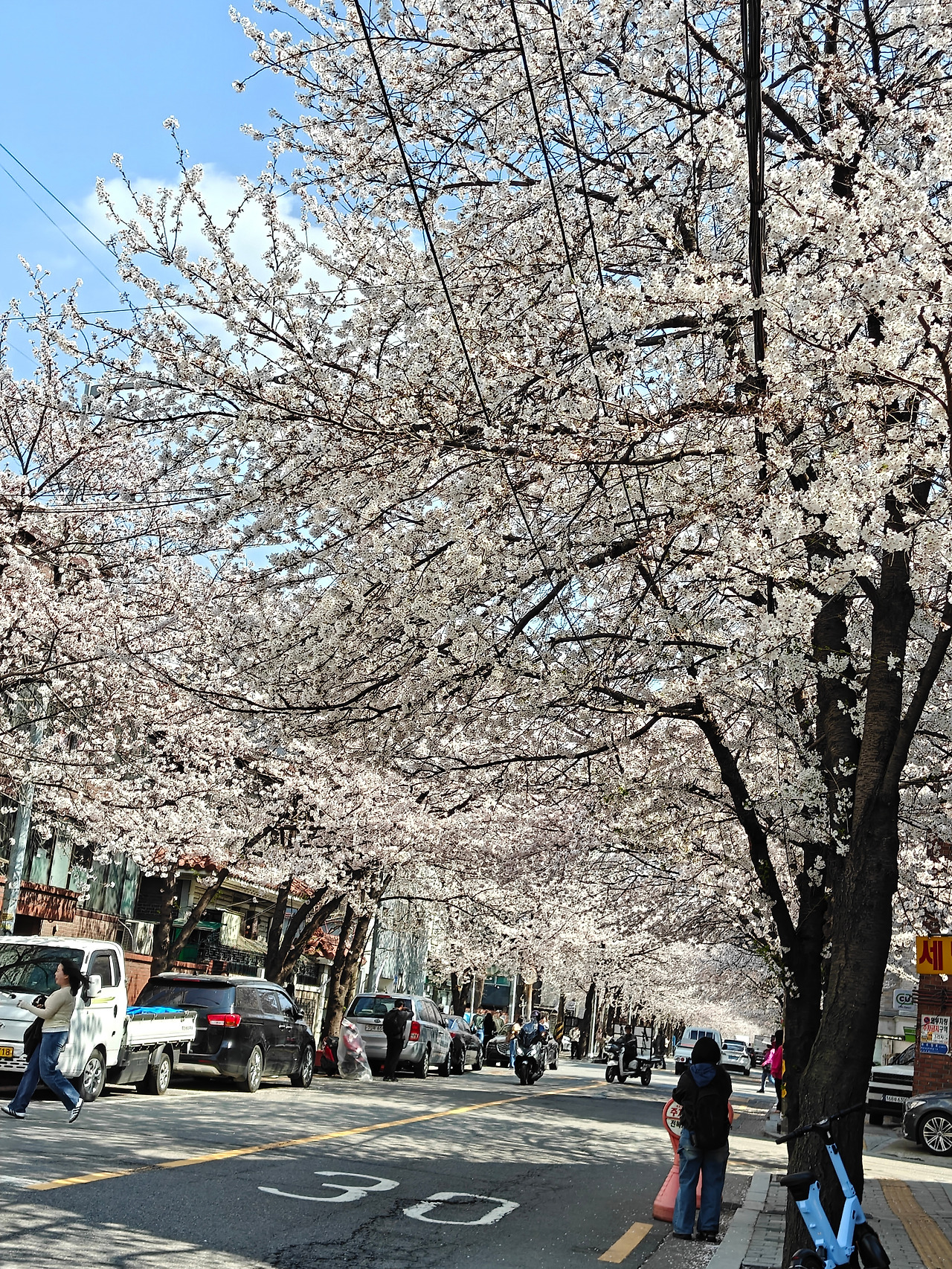 망원동 벚꽃길 구간은 500미터에 달하고, 양쪽 벚꽃나무가 하늘을 가릴 정도로 울창하게 만개했다.