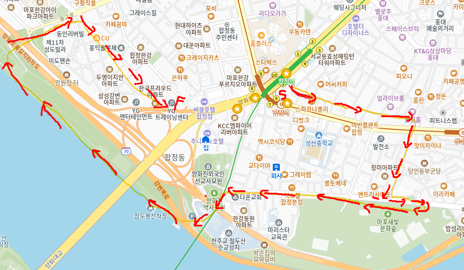 서교동까페골목-->롤링홀까지-->길을 건너 장미아파트와 앤트러사이트방향으로 벚꽃길을 보고 ->골프장이 있는 왼편으로 언덕길 벚꽃스팟을 지나서 길건너 유턴!! --> 이제 양화진(절두산)까지 벚꽃길을 보며 쭉 직진