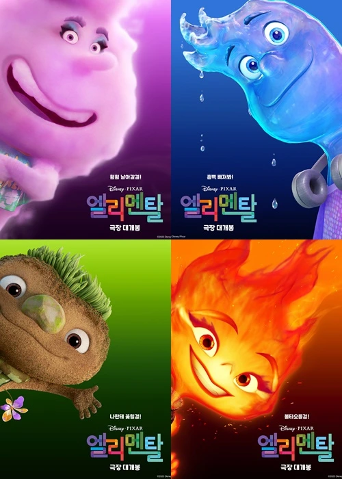 사실 <엘리멘탈>을 포스터로 처음 접했을 때는 '이거 했던 거 아니야?'라는 생각이었다. <인사이드 아웃>과 캐릭터 디자인이 비슷하다고 생각해서였다. 결과적으로는 픽사에게 미안한 선입견이었지만. 사실 캐릭터 디자인을 비슷하다고 느낀 것과 별개로, 픽사 애니메이션은 은근하게 비슷한 구석이 있다. 사회 전반에 대한 우화적 성질이라든가, 통통 튀는 창의력에서 기인한 전개들(그러나 다소 유치하거나 뻔한 구석이 있는)이 그렇다.