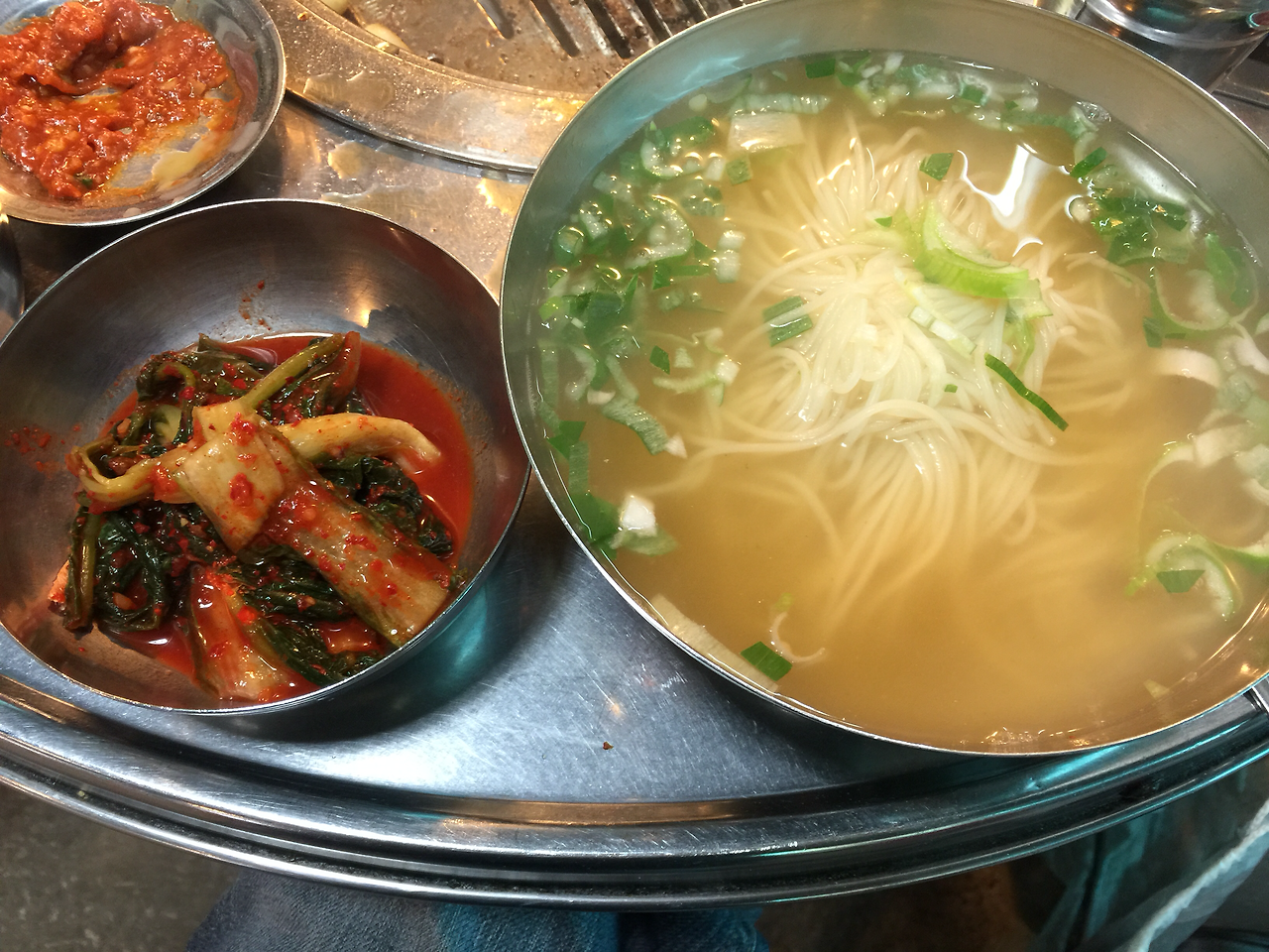 고기를 어느 정도 먹고 나면 오래 끓인 멸치다시 국물에 말은 국수 한 그릇이 또한 별미다.