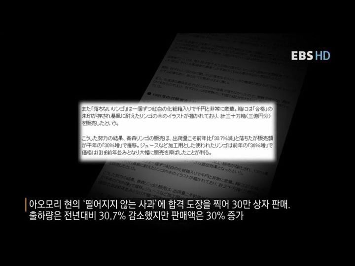 하지만 마을 사람들은 모진 비바람에도 떨어지지 않은 사과를 스토리텔링 하여 합격사과로 브랜드화하고 큰 성공을 거두었습니다.