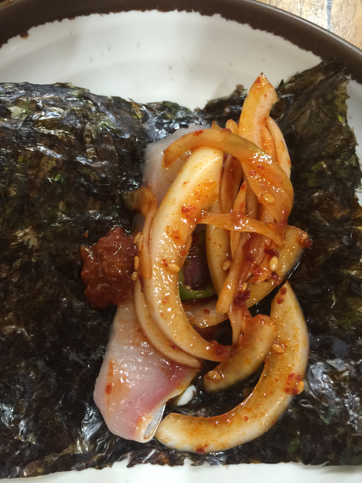 두 번째부터는 식당에서 가르쳐준 대로 생 김에 야채무침을 올리고 고등어를 갈치 속 젖에 찍어 쌈을 싸서 먹었습니다.