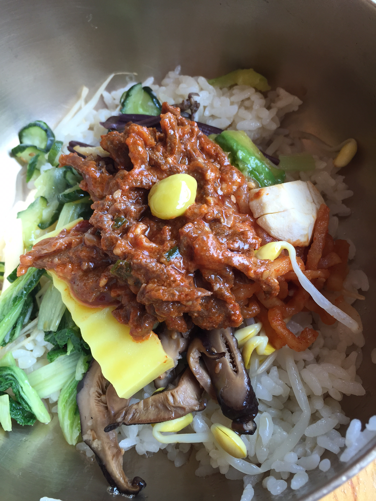 싱싱한 육회와 청포묵 무침, 불고기와 해물파전 그리고 전주비빔밥이 푸짐하게 함께 나오는 비빔밥 정식으로 맛있고 포만감 있게 잘 먹었다.