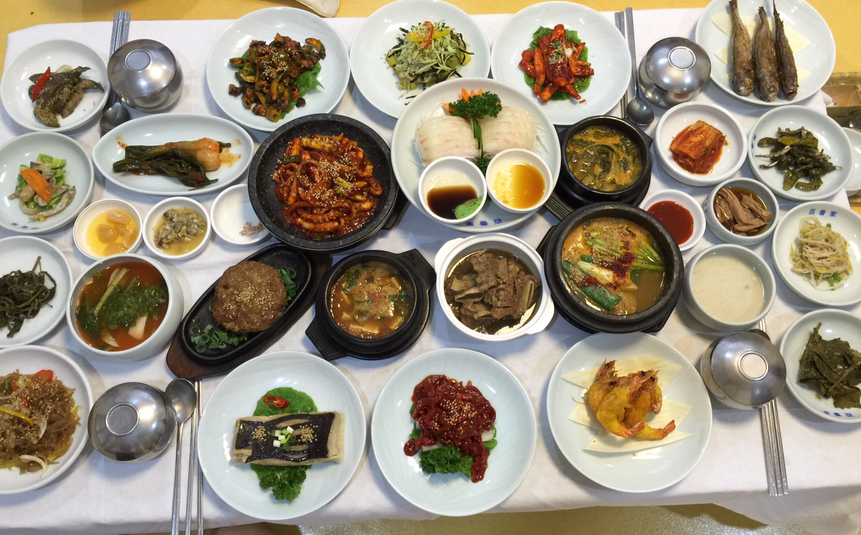 한상 떡 벌어지게 나온다. 일일이 열거할 수도 없다. 그리고 계속 나온다. 놓을 자리가 없어 포개 놓는다.