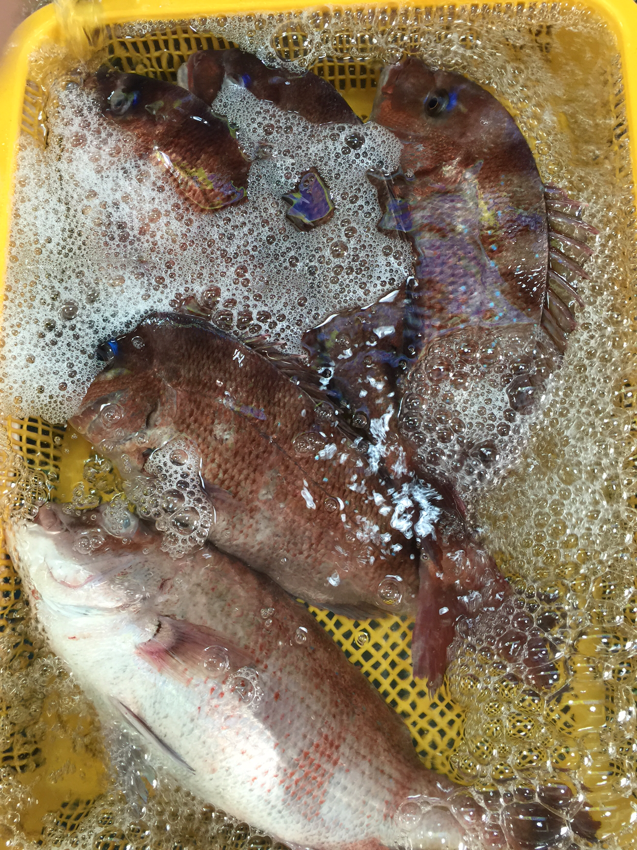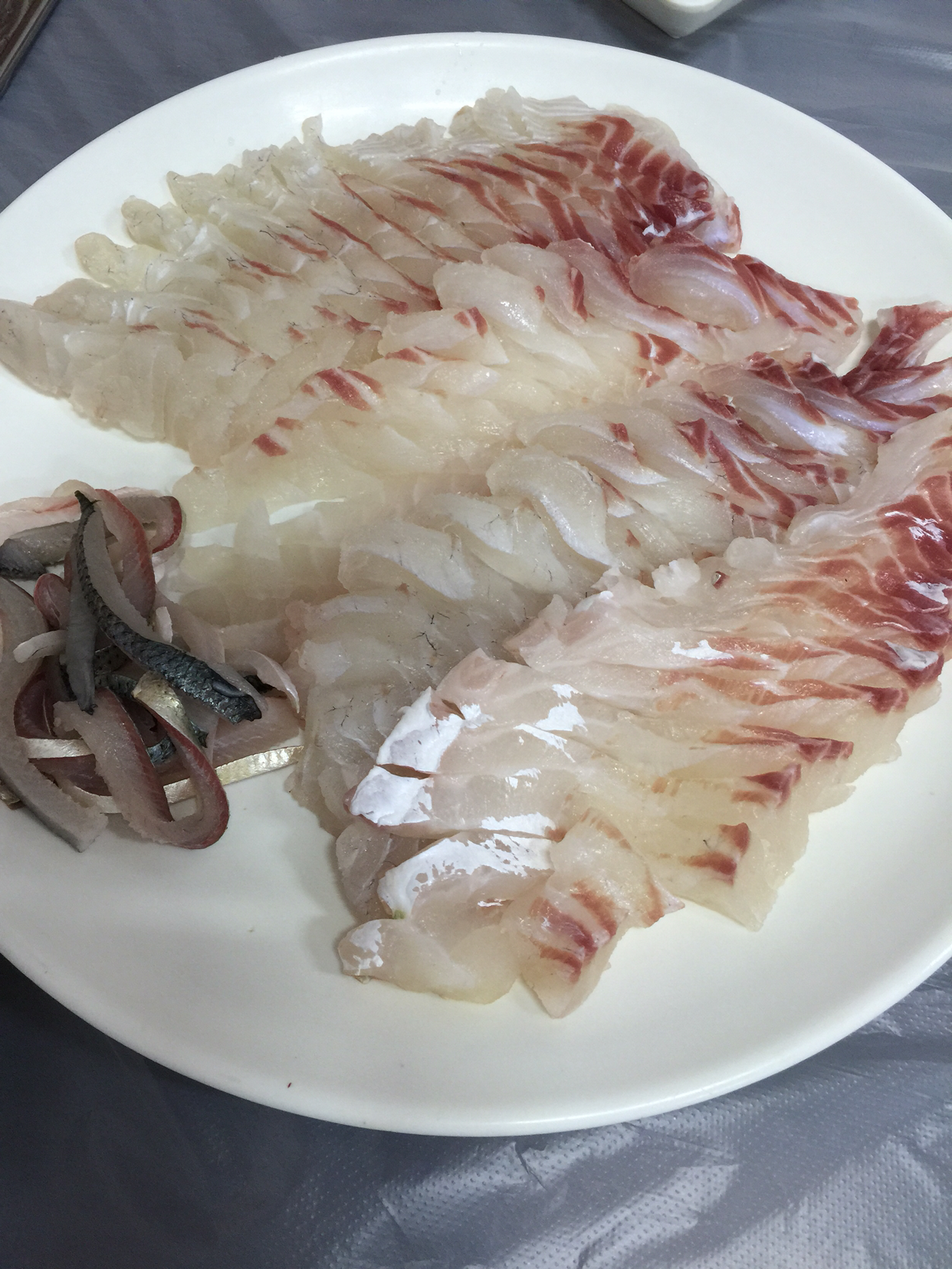 생선 좌판 뒤편에 있는 탁자 네게 짜리 식당에서 갓 잡은 도미회를 먹기 시작했다. 맛은 말할 필요가 없다.