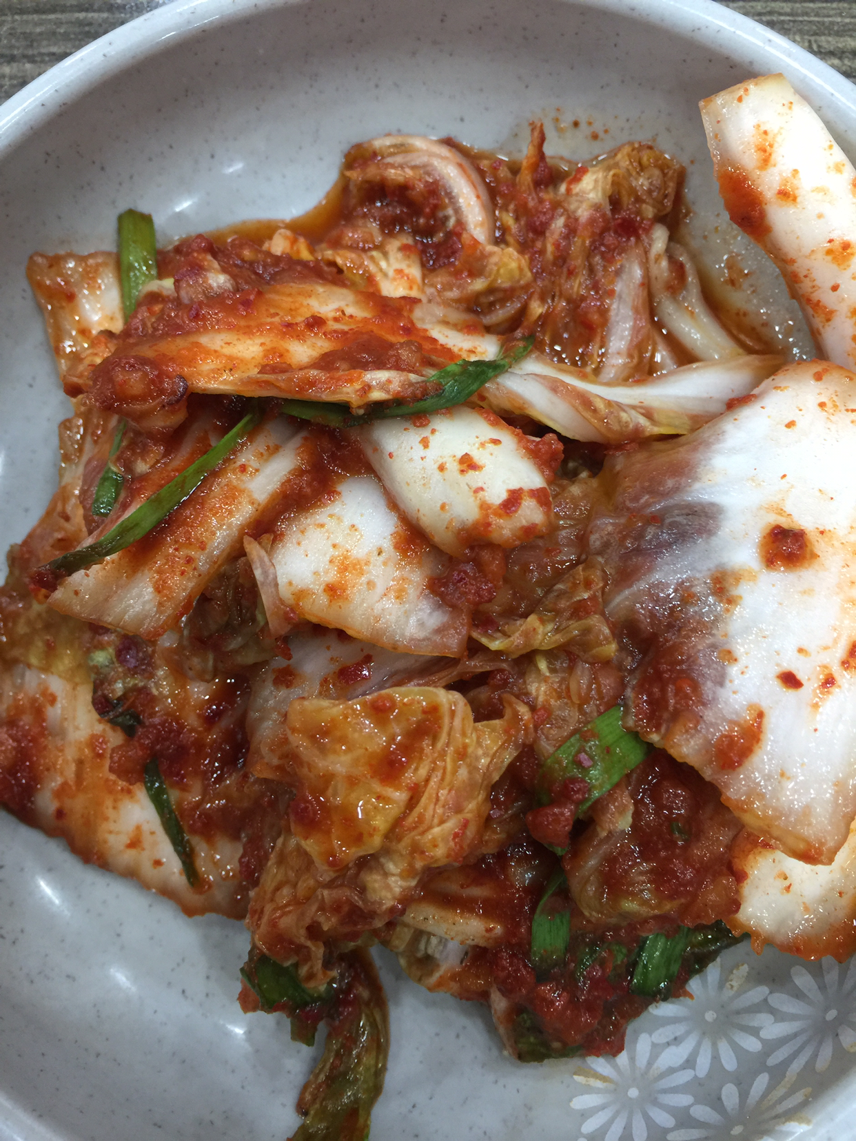 생고추를 돌절구에 빻아 절구 안에서 배추를 버무려 준다.