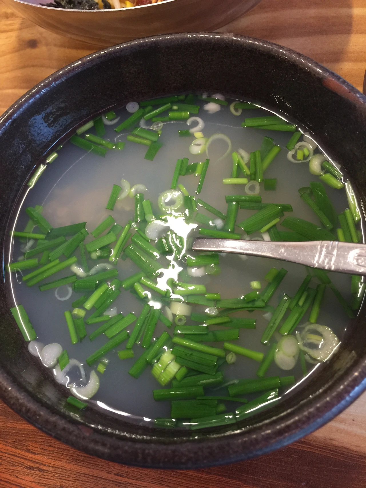 뽀얀 국물에 작고 작은 재첩 알갱이 그리고 부추...