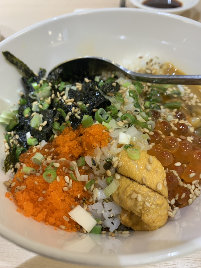 해삼 창자 젖인 고노와다와 고명으로 올려진 성게알과 날치알, 연어알이 잘 어우러져 입안이 개운하고 맛깔스럽습니다.