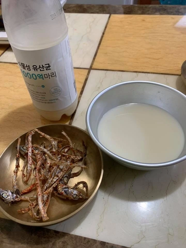 냉장고를 뒤져 풀치 볶음에 막걸리 마시고 있습니다.