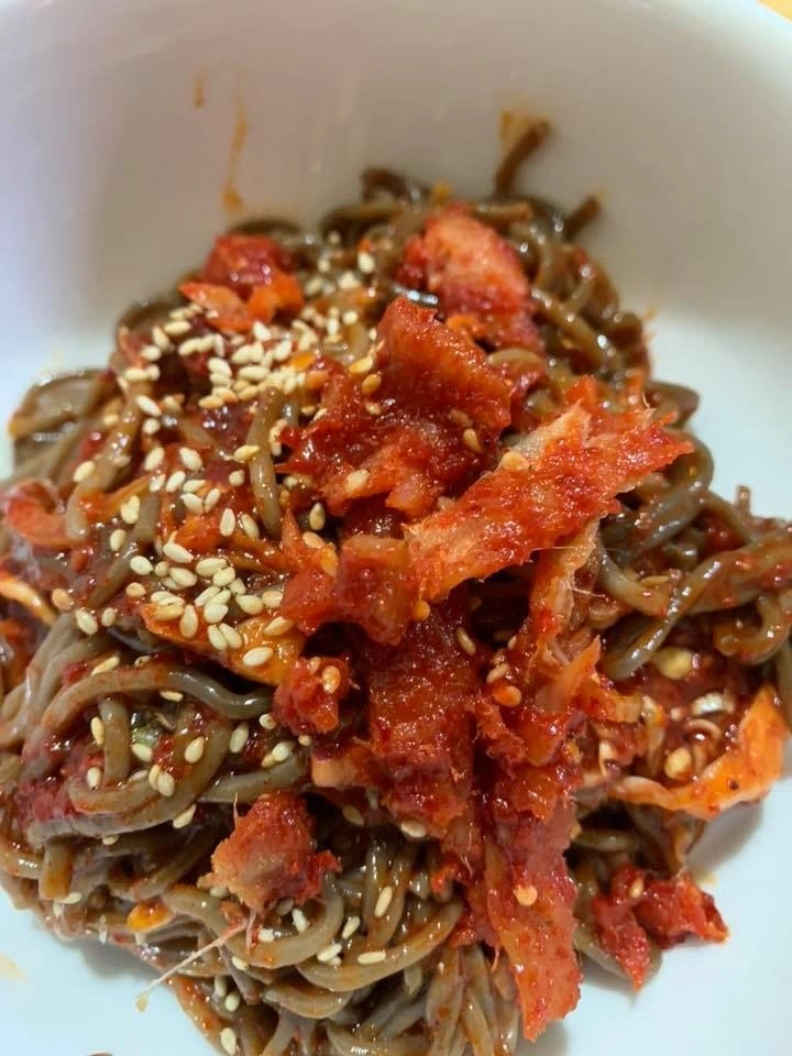 양념은 팔도비빔면 소스를 넣었고 속초중앙시장에서 택배로 구매한 명태무침을 함께 넣어 비볐습니다.