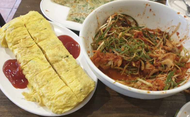 따뜻한 계란말이 한 조각을 케첩에 찍어먹었다.