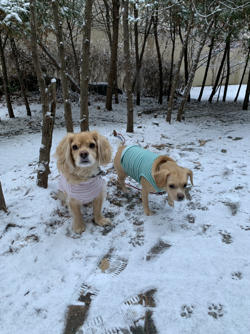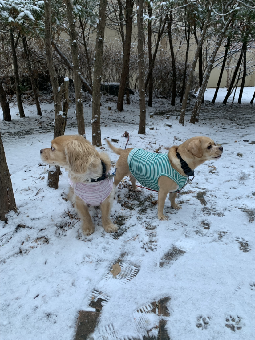 내리는 눈을 보며 강아지들이 이리 뛰고 저리 뛰며 좋아합니다.