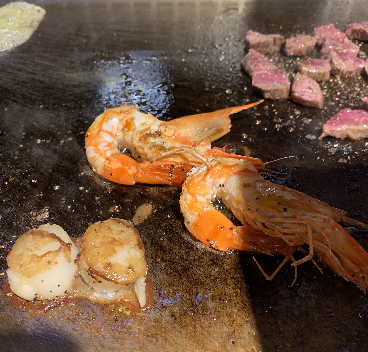 새우와 관자, 채끝살을 주문해 먹었습니다. 눈으로 보는 앞에서 현란하게 구워주는 철판구이는 기분상으로 더 맛이 있는 것 같습니다.