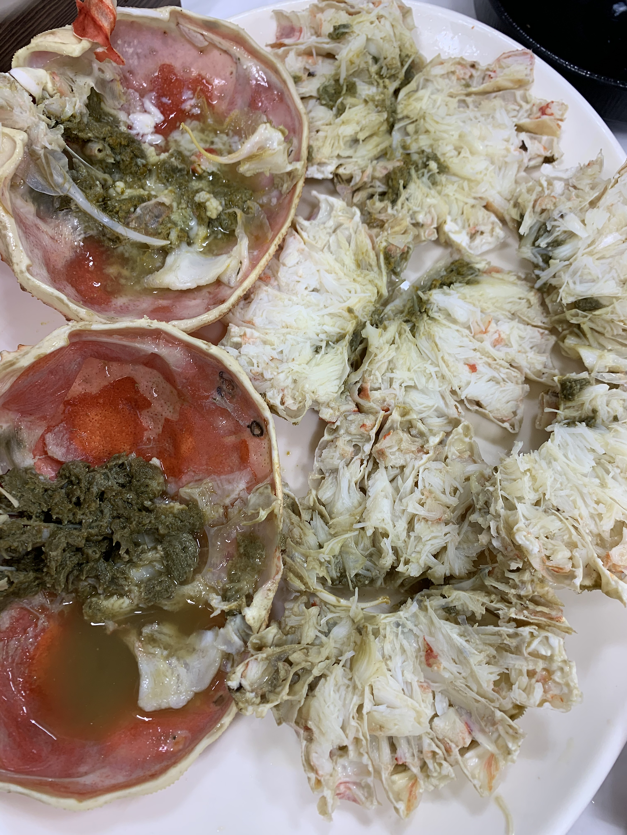 몸통에 박혀있는 살은 짭조름한데 파먹기가 쉽지 않습니다. 그래도 정성 들여 살을 잘 발라 게딱지의 내장에 비벼먹으니 맛이 끝내주네요.