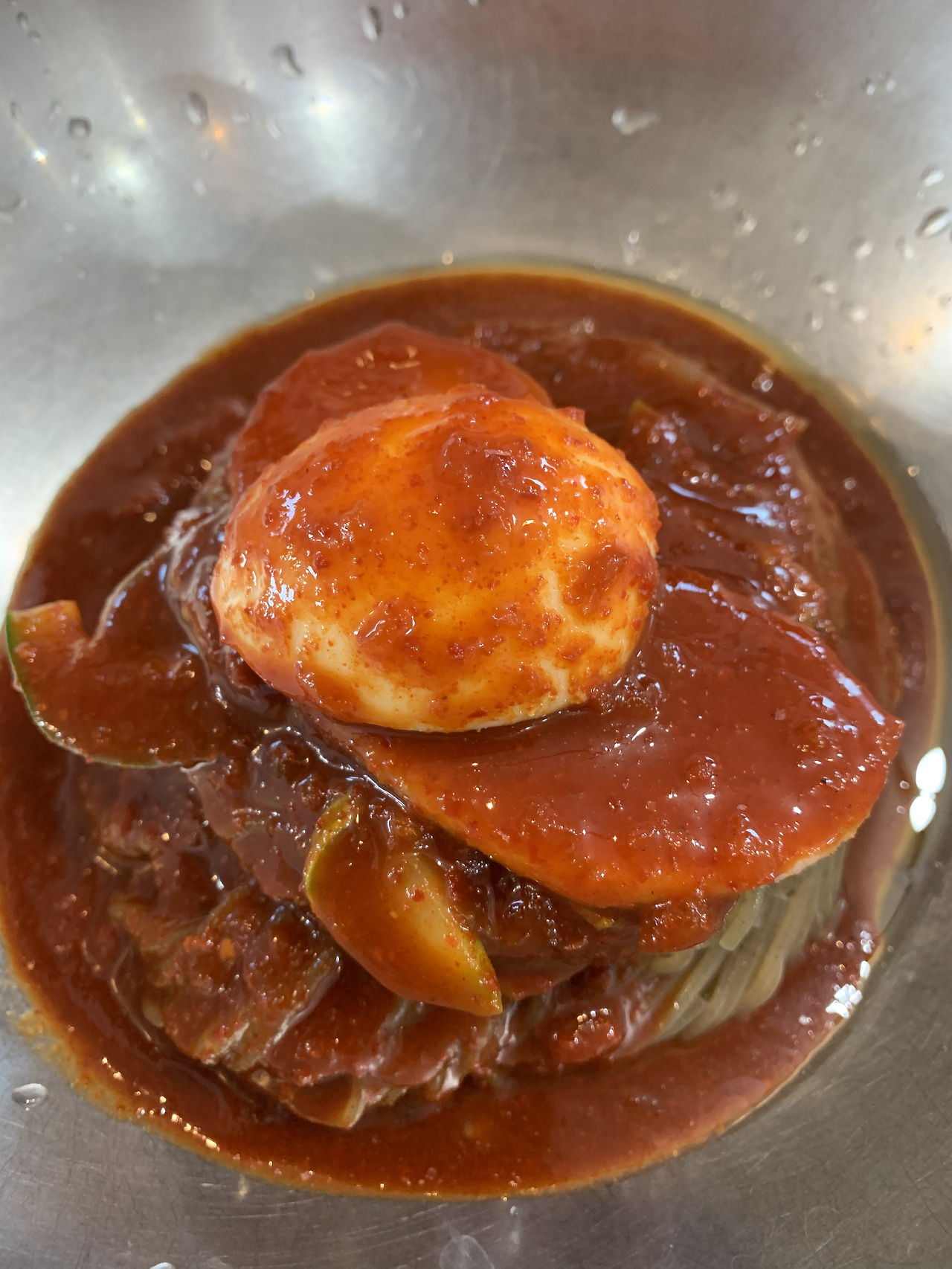 비빔냉면은 색깔은 빨갛지만 맵지 않습니다.