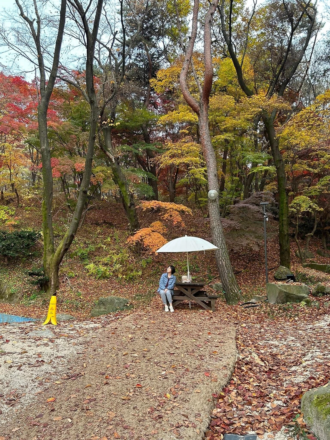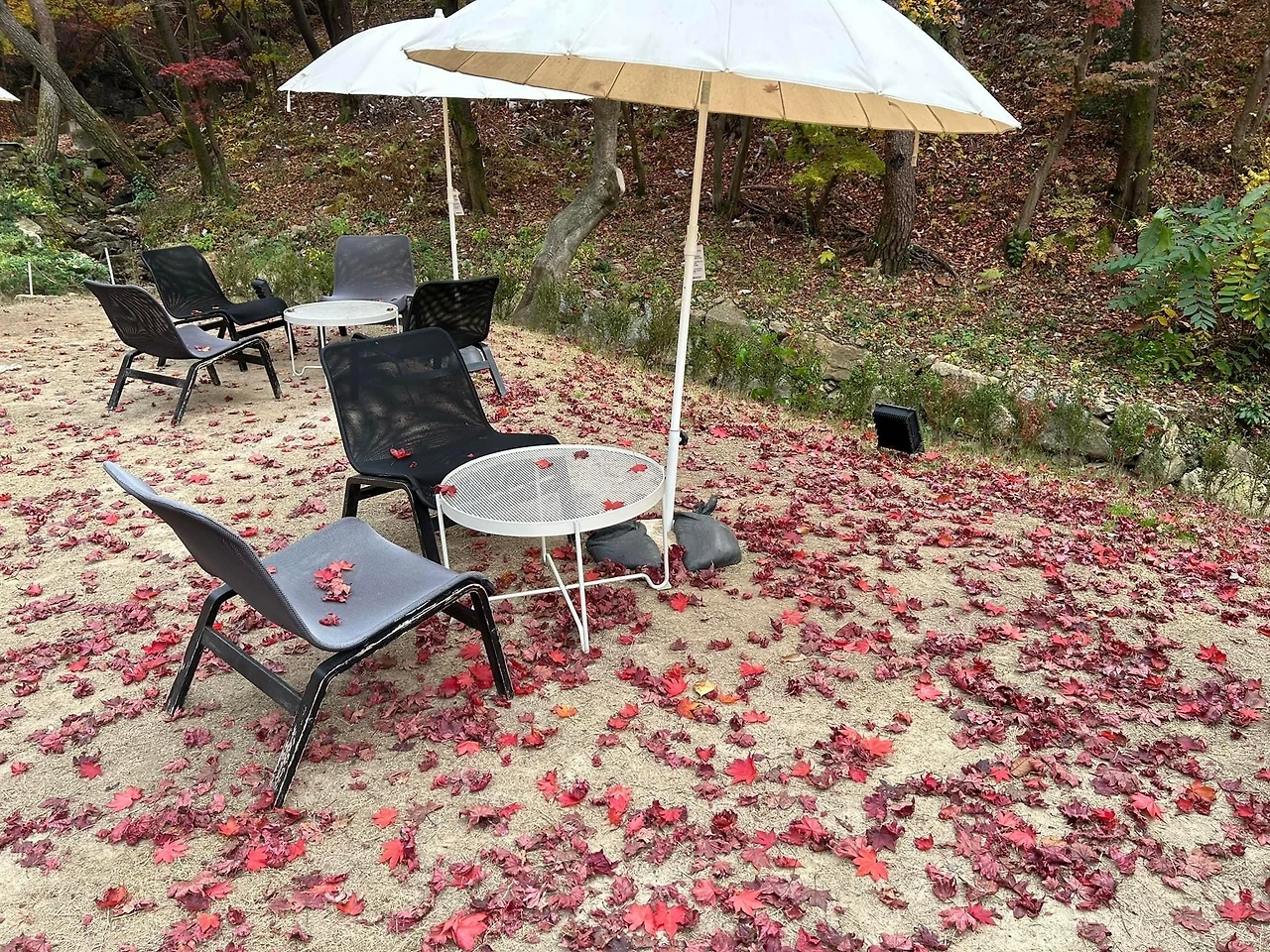 넓은 카페의 정원에 알록달록 단풍이 아름답습니다.