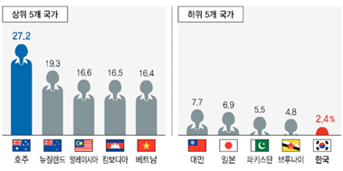 그러면 우리나라 기업들의 여성 리더 현황은 어떠할까? 미국 기업이나 여느 글로벌 기업과는 비교도 되지 않을 정도로 적다. 2017년 한 여성협회 보고서에서 아태지역 주요 20개국 상장기업의 여성 임원 비율은 평균 12.4%였다. 그런데 우리나라는 여성 임원 비율이 2.4%로 아태 지역 20개국 가운데 꼴찌다. 이 정도면 사실상 세계 수준으로 낮은 수치다.