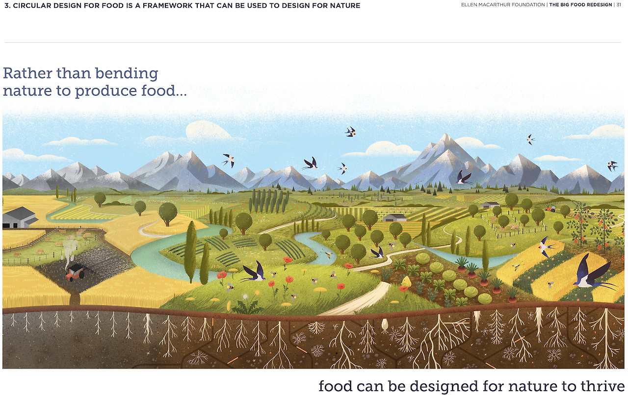 글로벌 10개 식품 기업을 콕 집어 자연을 소비만 하는 방식의 전통적 식품 생산 방식에서 벗어나 자연을 재생할 수 있는 방법으로 전환하라고 공개 발표한 The Big Food Redesign에서는 배출영향이 적은 방법으로 다양한 종을 키우고, 부산물을 재료로 활용하면서 재생농업을 할 것을 제안한다. 경축순환농업, 산림농업 (Agroforestry) 등을 포함하여 생태농업 (Permaculture)의 개념은 이미 잘 알려진 농법이기에 글로벌 식품 기업이 규모화 있게 지원하고, 구매하기 시작한다면 효과적 전환이 가능할 거라고 한다.
