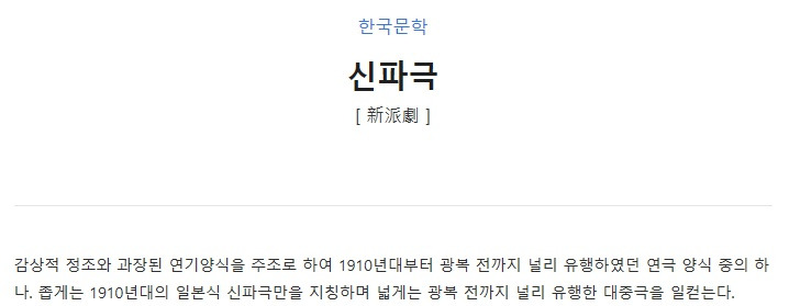 그리고 '신파'에 대해서도 함께 생각해보자. '신파'라는 장르는 "1910년대부터 1940년대까지 우리나라에서 유행하였던 연극 형태"라고 사전은 소개한다. 사전에서 지칭하는 말은, 일제시대에 우리나라에 유입된 하나의 연극 형태로서, 과장된 연기와 감성적인 감정을 주로 하는 연극의 갈래를 이야기하는 것이다. 이 시대의 신파극은 주로 '오락극'의 성격을 뗬다. 그래서 '웃음'을 목적으로 극단적인 감정의 표현을 기본으로 과장된 연기를 주로 했을 것이다.