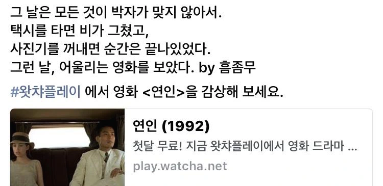 토요일 낮은 직장인에겐 나름 이른 시간이니까. 답장을 기다리지 않고 글을 쓰기 시작하는데 답장이 왔다. 지금 영화를 보고 있는데 내가 좋아할 만한 작품 같다며 추천을 해준다. 양가위 감독의 <연인>. 열 번은 넘게 돌려 본, 내가 매우 좋아하는 작품이다. 영화별로 별점을 매기는 어플인 왓챠에서 <연인>에 대한 감상평은 내 것이 1등이라며 짐짓 자랑스럽게 답장을 한다.