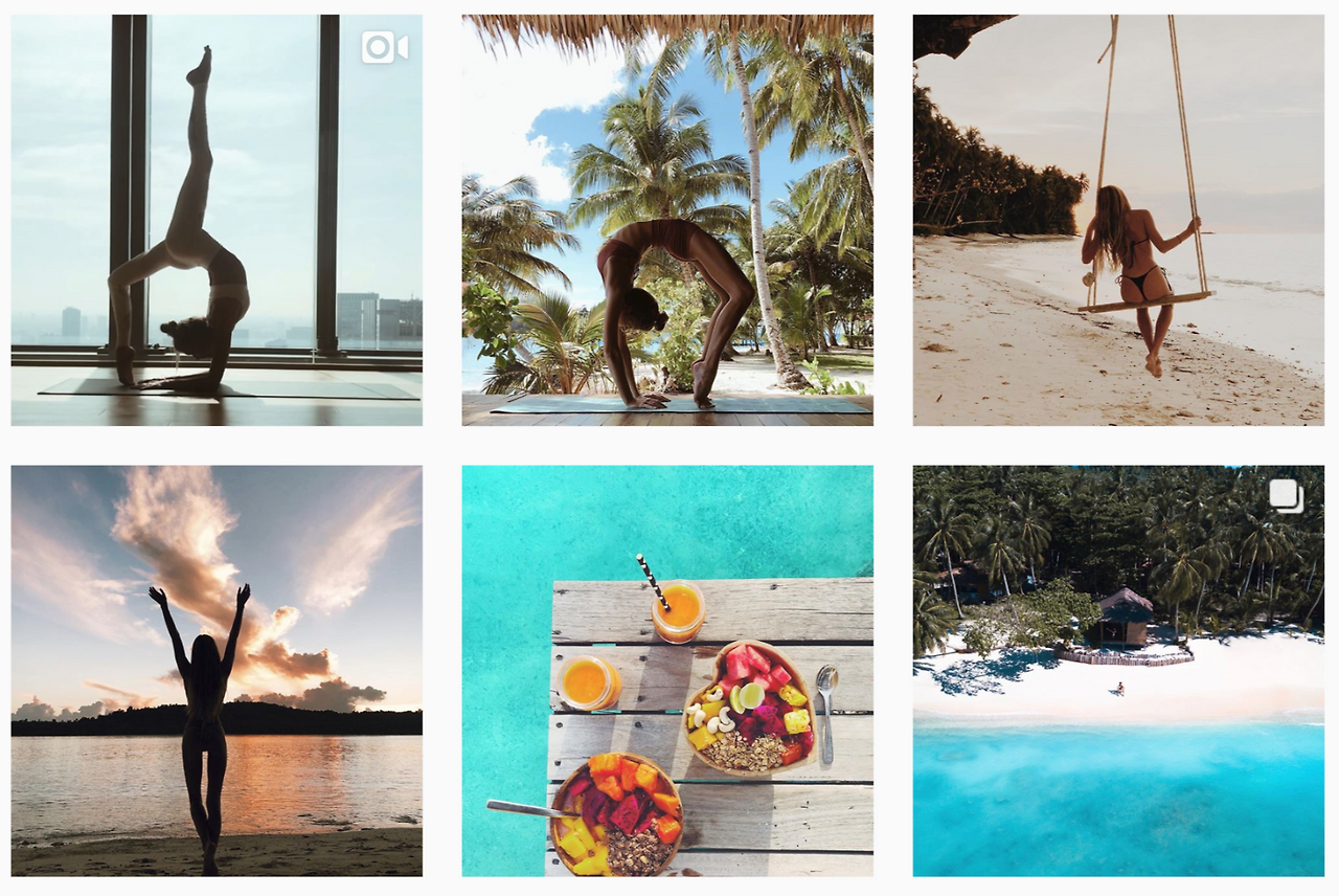 예쁘고 날씬한 몸으로 상당한 난이도의 동작들을 소화하고 있다는 것 외에도, 사실 많은 수의 '요가 유명 계정' 혹은 '요가 유명인'들이 보여주는 모습에는 상당한 공통점들이 있습니다. 일상과 결합된 요가를 강조하지만 동시에 상당수는 늘 어느 해안가나 특정 대도시들을 여행 중이고, 코코넛 음료나 특정 재료들이 들어간 샐러드들을 무척 즐기며, 환경 혹은 건강에 친화적인 화장품들을 종종 소개해주곤 하지요. 아, 물론 이 모든 것들을 약간 과장된 꺄르릇~하는 밝음과 함께 보여줍니다. 개, 고양이 혹은 아이와 함께 하는 것도 중요한 포인트들 중 하나고요. 쉽게 상상할 수 있는 것처럼, 인스타그램 상의 이러한 '요가 유명인'들의 적지 않은 수는 상품 광고 모델이거나, 혹은 본인 스스로가 웰빙 - 건강 - 미용 관련 사업가입니다. 인기 계정들이 프로모션 하는 사진들 또한 다양한 방식으로 관련 상품들의 광고를 하고 있다고 봐야겠지요.