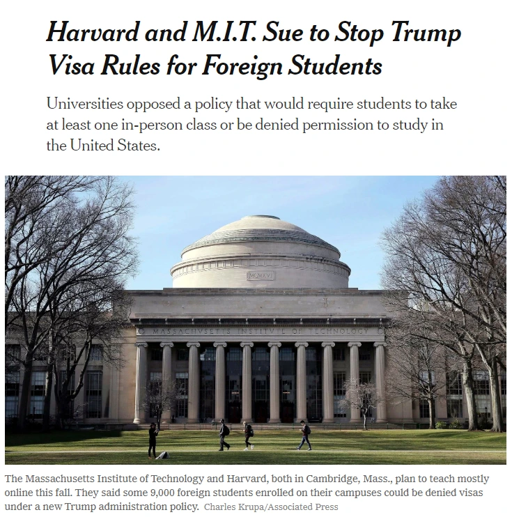 대학의 목소리는 날카로웠다. 지난 6일 온라인으로만 수강하는 외국인 유학생들의 비자를 취소하겠다는 트럼프 행정부의 일방적인 방침에 하버드와 매사추세츠공대(MIT)가 반기를 들었고, 트럼프 행정부는 약 일주일 만에 꼬리를 내렸다.