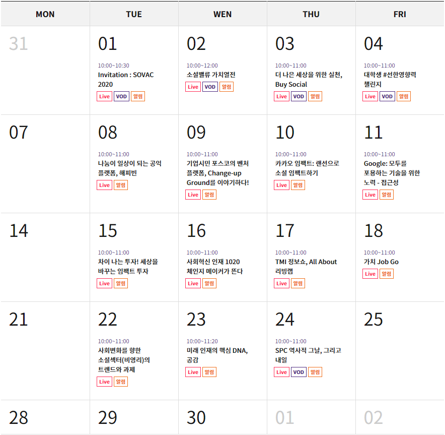 SOVAC2020은 지난 1일부터 4주간 매일 다른 프로그램을 진행하고 있다. 자칫 사회적 가치라는 모호한 주제가 온라인 진행으로 더욱 막연해지지 않을까 하는 우려가 들 수 있는데, 타임 테이블을 살펴보면 그 걱정은 기대로 바뀐다. 오히려 온라인이기에 가능한 콘텐츠들이 올해 SOVAC을 더욱 빛낸다.
