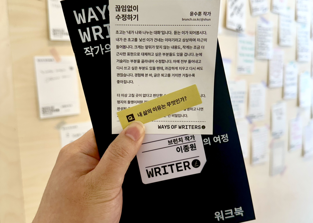 다음 전시 공간으로 넘어와 브런치 대표 작가 5인의 애장품과 글쓰기에 관한 생각들 그리고 최근의 화두인 '텍스트힙'에 대한 생각을 접했다. 다양한 소재들로 '글쓰기'에 대한 용기와 재미를 깨우칠 수 있었지만, 전시 공간에 머무른 40분 동안 '내 삶의 이유는 무엇인가?'라는 질문에 대한 명확한 답을 내리지 못해 답답할 뿐이었다. 다행히도 저녁 즈음에 집으로 돌아와 팝업전시에서 받은 워크북을 살펴보며 질문의 답에 조금이나마 접근할 수 있었다.