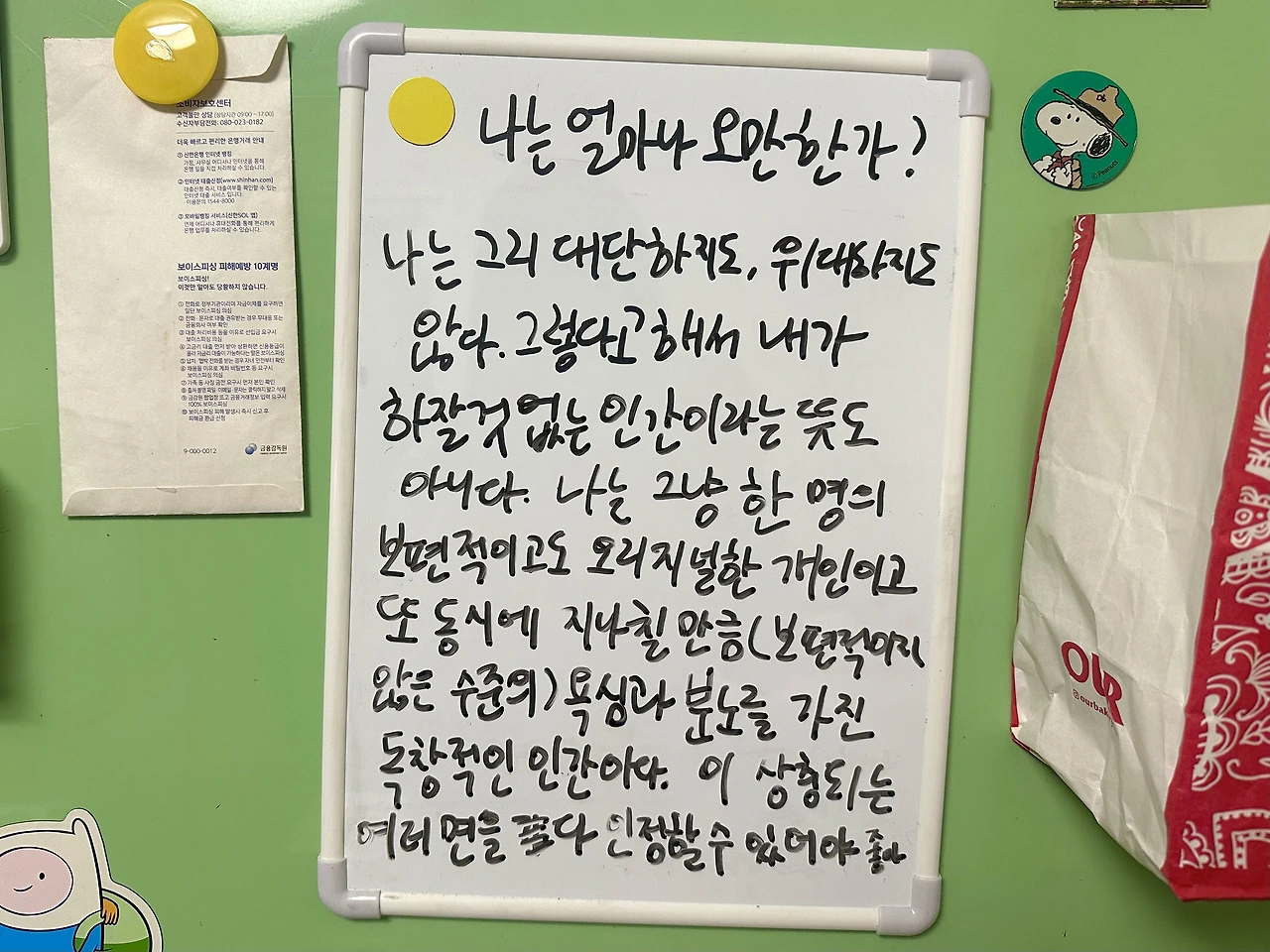 그래서 이 <명언해석기>가 내게는 무지막지하게 중요하다는 소리다. 한참 전에도 적었지만, 평생을 남의 말 안 듣고 나 하고 싶은 대로만 하면서 살아온 나 자신을 좀 돌아봐야 하기 때문이다. 이미 늦었을지도 모르지만, 이제와서라도 나는 세상 사람들이 하는 말을 좀 이해해보고 싶다. 반드시 살아내야만 하는 이 삶에서 내가 나 스스로를 지금보다 더 고통스럽게 만들기 전에, 반드시 살아내야만 하는 이 삶을 진심으로 내가 원하는 방식으로 살아내기 위해서, 무엇보다도 나 스스로의 인간적인 성장을 위해서. 모두가 공감하고 이해하는 '보편적 가치'를 내 정신과 마음속에도 진정으로 깊이 새겨 넣고 싶다. 나는 최근 들어 일이 없어서 도무지 용도를 찾지 못하게 된 사무실의 화이트보드에다 '나는 얼마나 오만한가?'로 시작하는 글을 적었다. '나는 그냥 한 명의 보편적이고도 오리지널한 개인이고 또 동시에 지나칠 만큼 욕심과 분노를 가진 독창적인 인간이다.' 이게 맞다. 나는 이렇게 살고 싶다. 나는 평범한 인간이다. 그러나 동시에 독창적인 인간이기도 한 것이다. 세상 어디에도 나와 완벽하게 똑같은 인간이란 결코 존재할 수가 없기 때문에! 그래서 나는 분노하고, 그래서 나는 욕심을 낸다. 보편적인 가치와 언어를 진심으로 인정하고 존중하면서 동시에 내가 믿는 가치를 세상에 설득시킬 수 있을 만큼 그것들을 잘 활용하는 사람이 되고 싶다. 그러면서도 오만했던 젊은 시절의 내가 빚어낸 멋지고 소중한 이상과 꿈, 가치관을 내려놓지도, 다치게 만들지도 않는. 제멋대로만 살지 않고 남의 말도 잘 듣는 내가 되기를, 간절하게 소망한다.