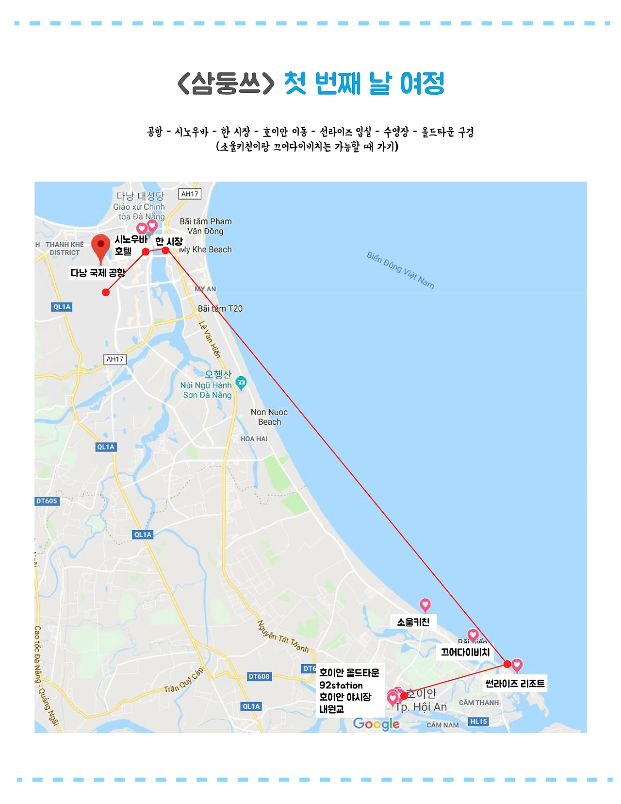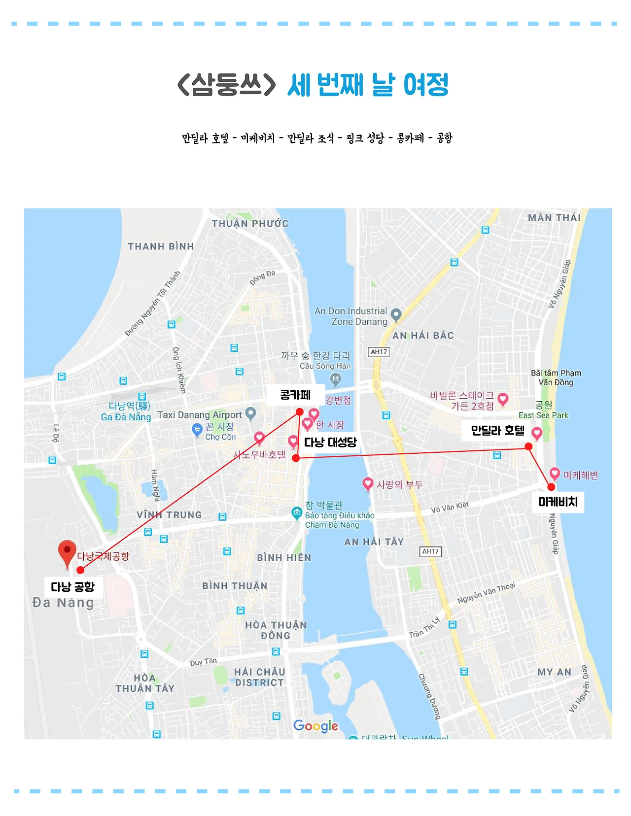 침대 3개가 한 방에 있는 숙소는 처음이었는데 편했습니다. 화장실이나 숙소 상태도 꺠끗했고 조식이 맛있었어요.(서양식이라 너무 좋았음... 동남아 음식 잘 못먹는 1인) 수영장은 생각보다 많이 작아서 실망, 뷰도 별로 예쁘지 않아요. 그래서 인근에 미케비치에 가서 시간을 보냈습니다.