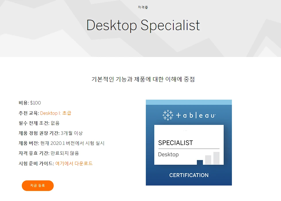 1번 같은 경우는, 본인이 회사에서 거의 매일같이 태블로를 사용하고 있기 때문에 사실 공부 분량이 그리 많지 않을 것 같았다. 실제로 태블로 데스크탑 스페셜리스트는 태블로 자격증 중 가장 basic 한 자격증으로, 태블로를 3개월 동안 사용한 사람이면 딸 수 있다(?)고 명시되어 있다. 내가 처음으로 태블로를 접한 것은 2019년 여름이었으니, 1년 6개월이 조금 안 되는 제품 경험을 가지고 있는 것이다.